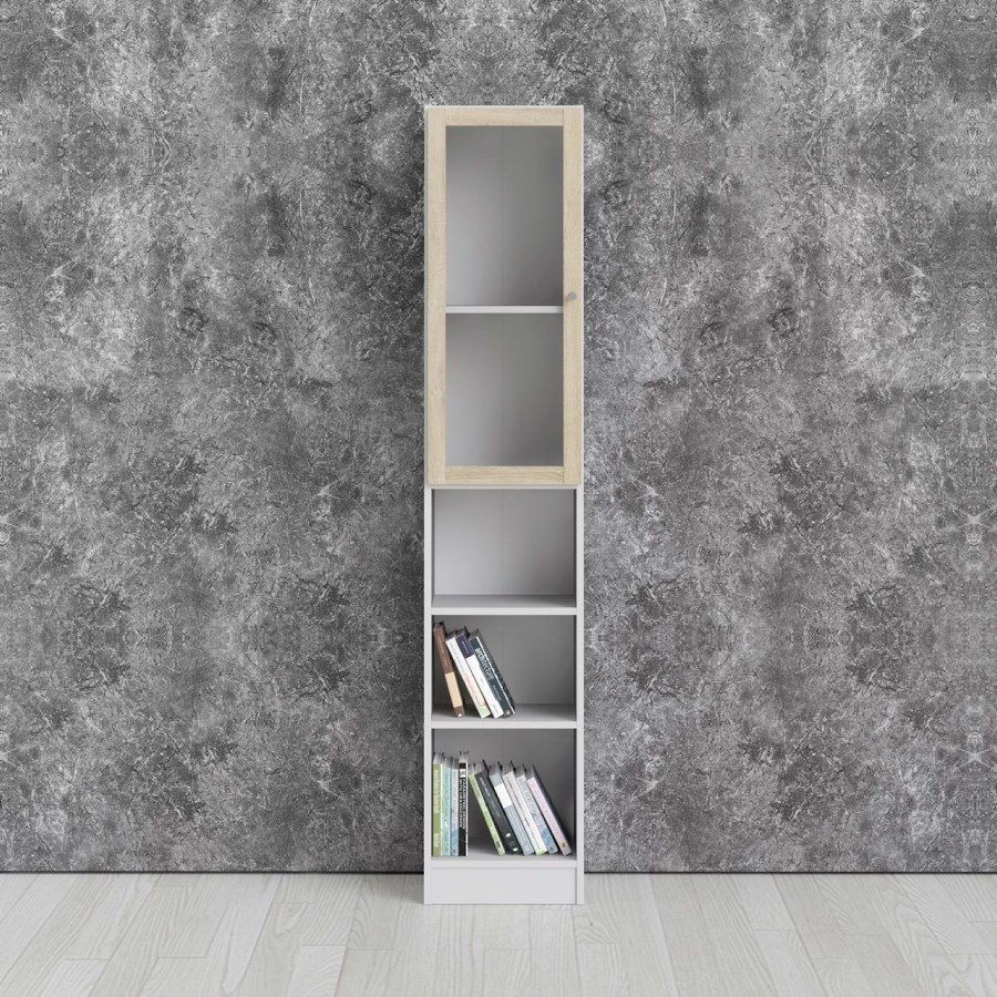 Base wandkast 1 glazen deur en 2 planken wit, eiken structuur decor.