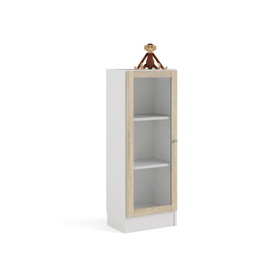 Base wandkast 1 glazen deur wit, eiken structuur decor.
