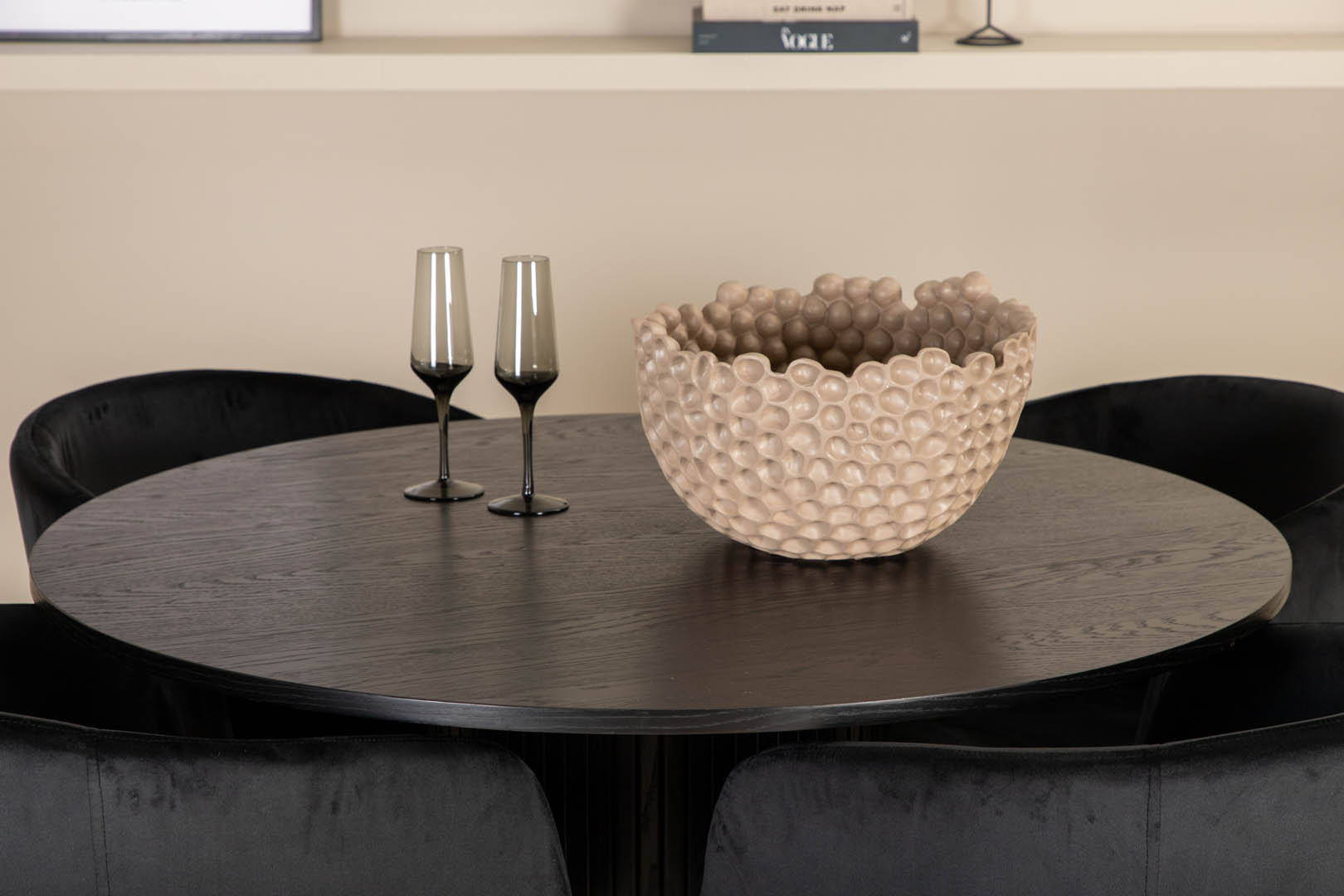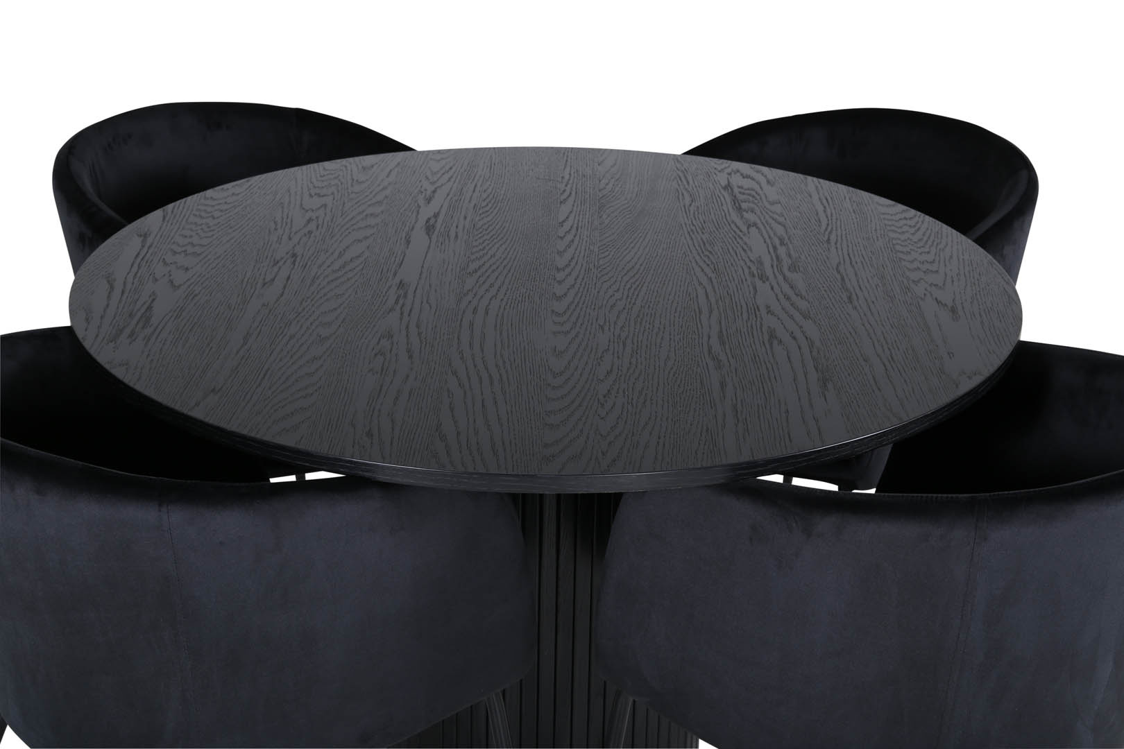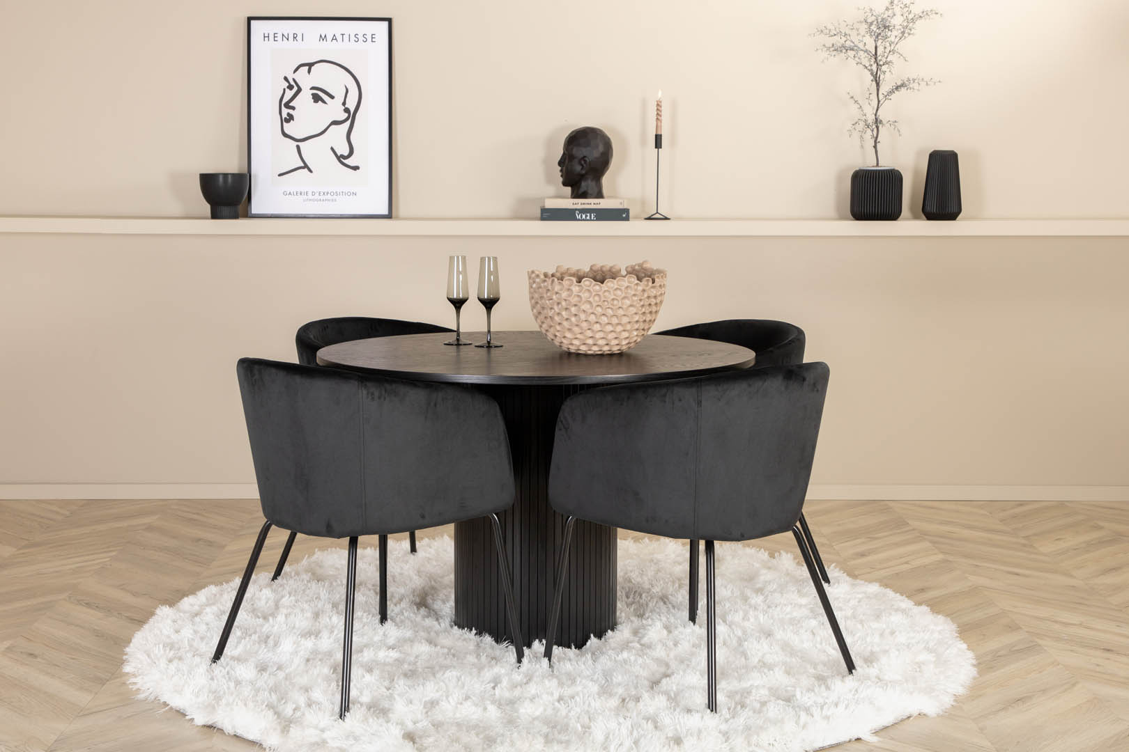 BiancaROBL eethoek eetkamertafel zwart en 4 Berit eetkamerstal velours zwart. Bianca tafel 60-15596-848. Øcm 110. Tafel cm: L110 x D110 x H74. Tafel: MDF, eik fineer, populier hout . Berit stoel 60-15562-888. Aantal 4 . Met armleuningen. Stoel cm: B55 x H78 x D55. Zithoogte cm: 49. Zitdiepte cm: 45. Zitbreedte cm: 55. Maximaal gewicht kg.: 150. Stof. Velours. Stoel: 20% polyester linnen, 80% velours, ijzer .