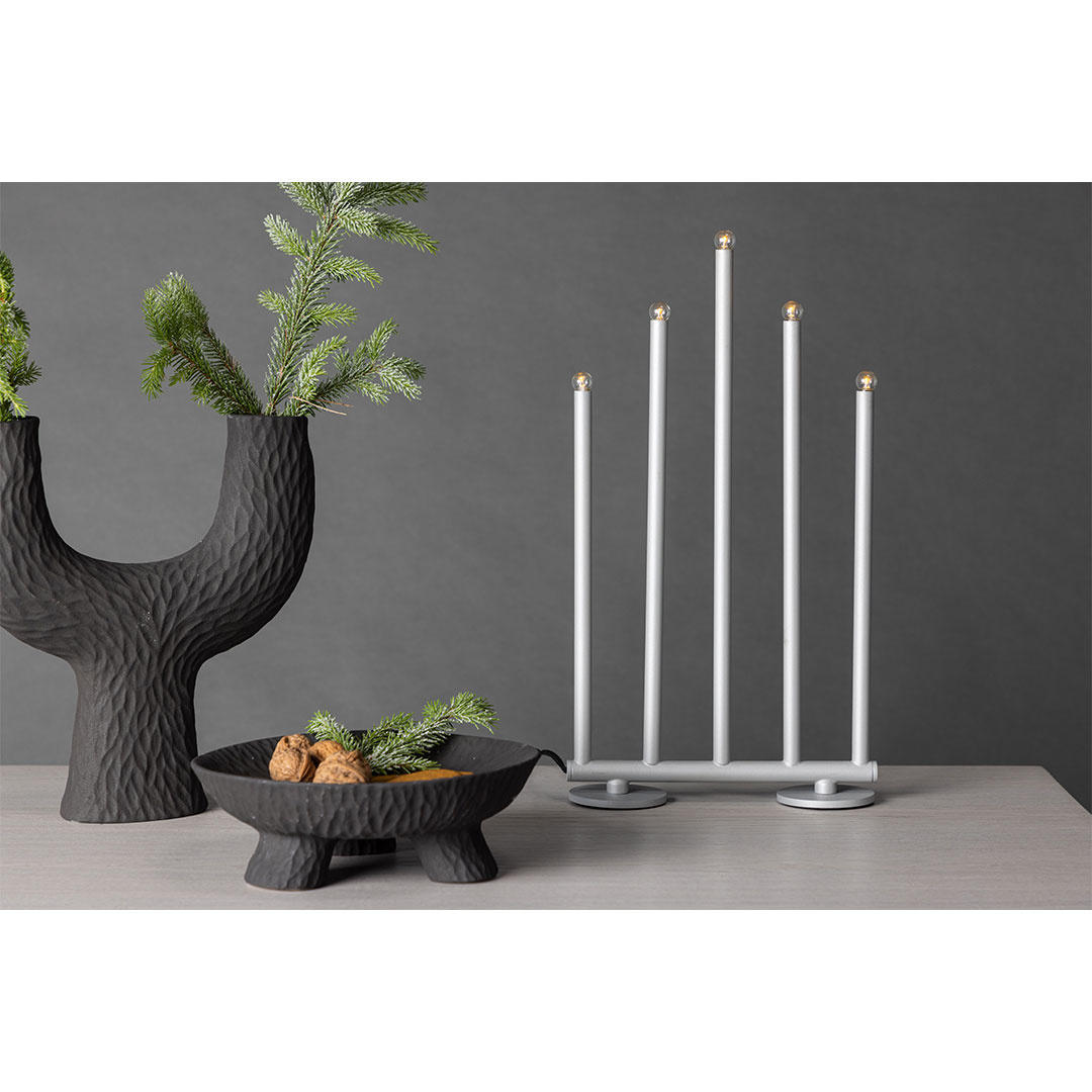 De Björnfjället adventspodium elektrisch 5 lichts zilverkleurig is een kerstverlichting in zilverkleur die zowel stijl als functionaliteit in huis brengt. Björnfjället adventsstandaard elektrisch 5 lichts zilverkleurig. Lichtbron: E10. Watt (W): Max. 0,5 W* 5. Incl. gloeilamp. Bjørnfjeldet is geen gewone adventskaars: deze zilverkleurige adventskaars in driehoekige vorm verspreidt warmte en rust in je huis tijdens de koude wintermaanden! Bjørnfjeldet is gemaakt van zilverkleurig staal en staat op een smalle plaat met daarop zeven smalle lampen die een aangename gloed in de kamer verspreiden. Maar hier komt het beste: u kunt het licht eenvoudig dimmen om voor elke gelegenheid de perfecte sfeer te creëren. Of u nu gezellig en ontspannend licht of een levendige en levendige gloed wilt, Bjørnfjeldet geeft u de mogelijkheid om de verlichting aan uw wensen aan te passen. Deze lamp is niet alleen een technisch hoogstandje, het is ook een veelzijdig interieurdetail dat perfect past in verschillende stijlen. Bovendien is Bjørnfjeldet verkrijgbaar in twee verschillende maten en kleuren, dus of je nu een grote of kleine ruimte hebt, je kunt de perfecte pasvorm vinden. Verhoog dus deze winter het stijl- en gezelligheidsgehalte in je huis en geniet van een prachtig interieurdetail uit de Bjørnfjeld-serie! Afmetingen: 40 cm.