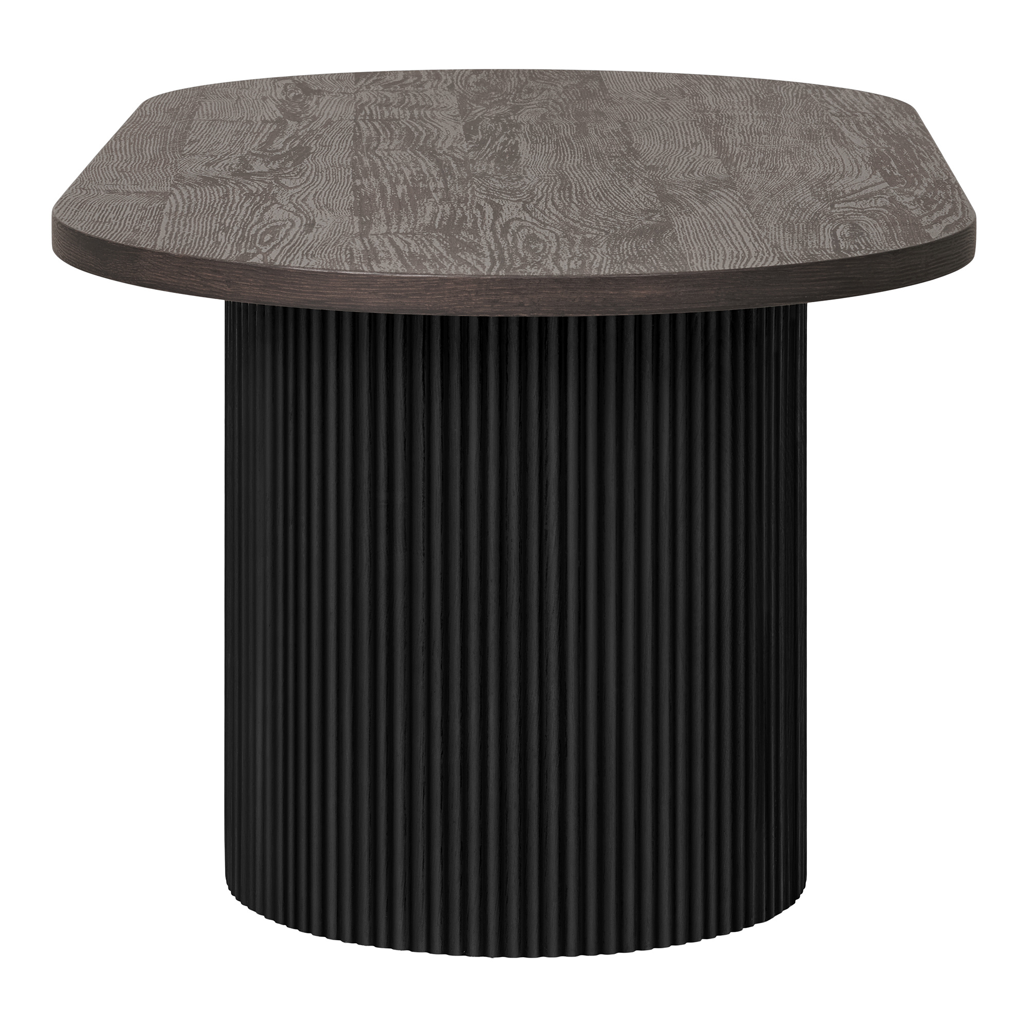 Deze stijlvolle eettafel combineert klassiek design met moderne details. Het ovale tafelblad in donker hout geeft een elegante en verfijnde uitstraling, terwijl de geribbelde houten poten een uniek visueel element toevoegen dat het verder eenvoudige ontwerp doorbreekt. De tafel is ruim en robuust, waardoor hij ideaal is voor zowel alledaagse maaltijden als feestelijke bijeenkomsten. Het is een perfecte combinatie van functionaliteit en esthetiek voor uw eetkamer.
