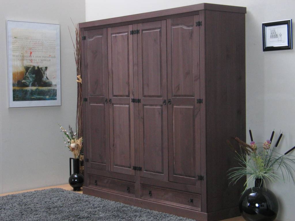 - Kast met 4 deuren en 2 lades van massief grenenhout; koloniaal/donkerbruin gebeitst en gewaxt