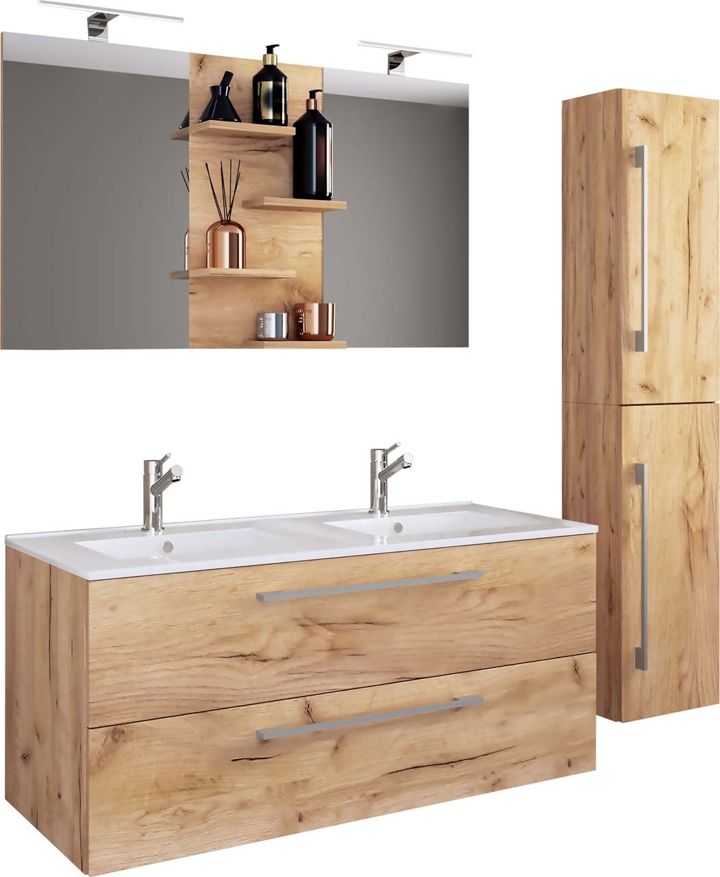 BudasiS badkamer dubbele wastafel eik decor. 3 delen. . Incl. wasbak. Zonder kraan. Wastafel: H 51 x B 111 x T 46 cm. Zonder licht. Spiegel: H 59 x B 112 cm . Kolomkast: H 150 x B 33 x T 22 cm. Je ontvangt meubels van een goede kwaliteit met een aangenaam comfort, gemaakt in een stijlvol en mooi design. Onze meubels zijn zeer aantrekkelijk geprijsd. Creëer uw eigen persoonlijke stijl met een nieuw meubel. Combineer met kleinmeubels of een paar mooie woonaccessoires. Hier verkrijg je de nieuwe woningtrends, zoals je ze in tijdschriften en magazines ziet. Bij ons vindt u unieke, praktische en comfortabele meubels met elk zijn eigen, mooi en apart design.