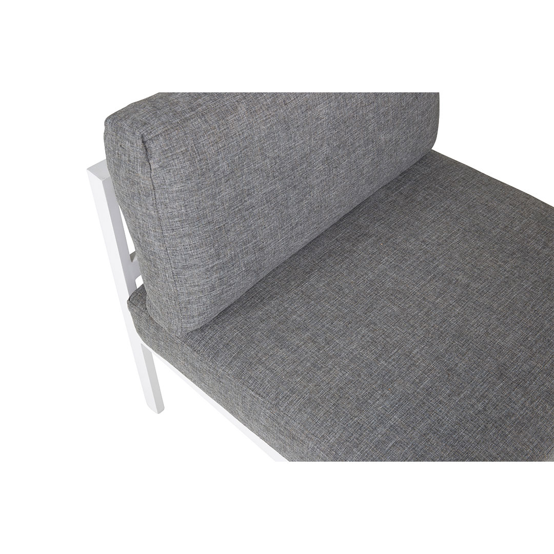 Het Copacabana tuinbankmiddengedeelte in het wit is een stijlvolle en comfortabele oplossing voor uw buitenlounge. Dit middengedeelte is ontworpen met een zithoogte van 30 cm, een zitbreedte van 70 cm en een zitdiepte van 70 cm, waardoor een ruime en comfortabele zitervaring ontstaat. De stoel is voorzien van zachte kussens, die zorgen voor extra comfort. Met een maximaal draagvermogen van 150 kg is dit middelpunt zowel duurzaam als stabiel. Het witte frame en de grijze kussens geven een moderne, minimalistische uitstraling die perfect past bij een moderne buiteninrichting. Combineer dit middelpunt met andere stukken uit het Copacabana-assortiment om een op maat gemaakte loungeset te creëren die bij uw buitenruimte past.