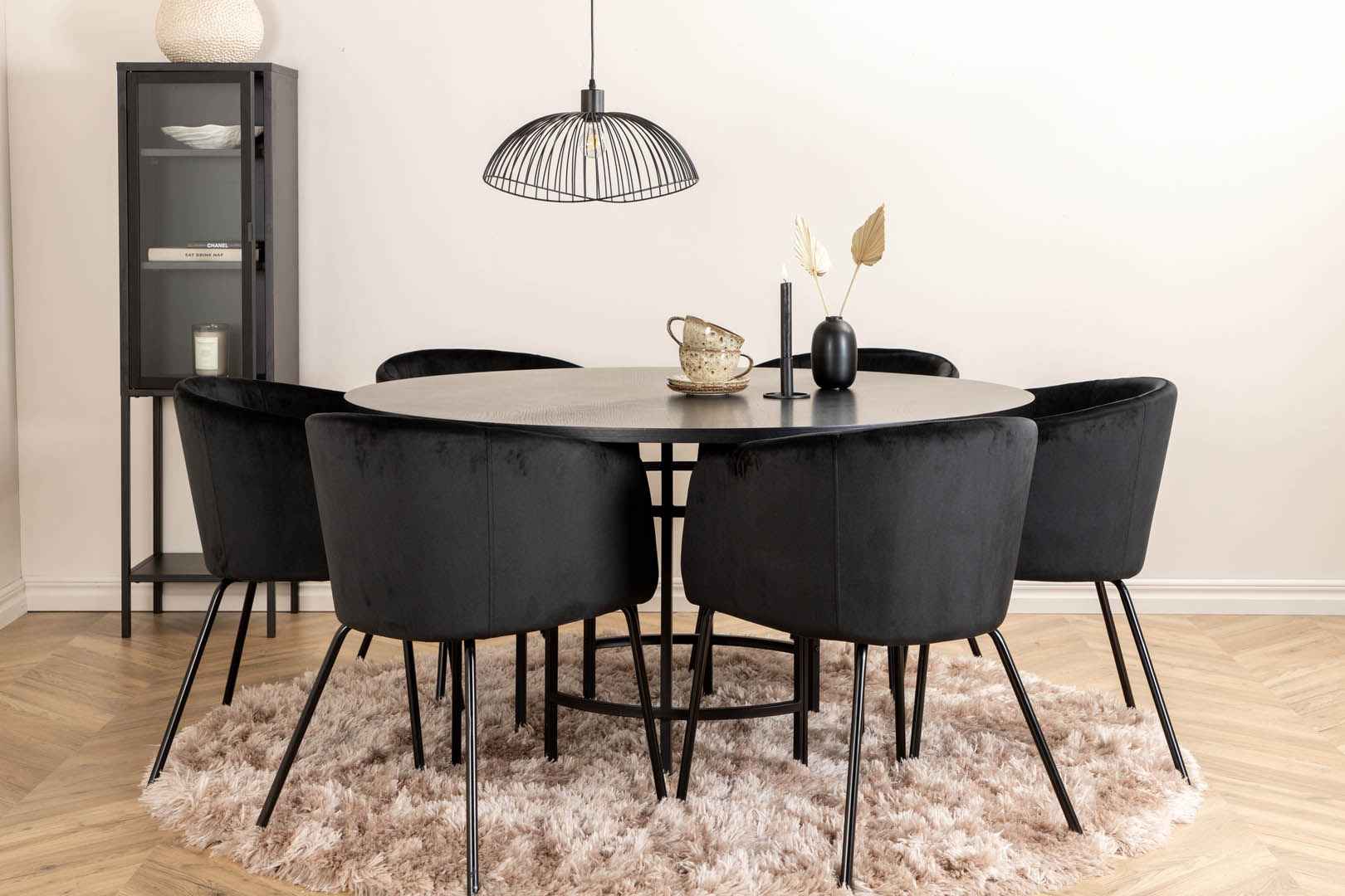 Copenhagen eethoek eetkamertafel bruin en 6 Berit eetkamerstal velours zwart. Copenhagen tafel 60-15009-488. Øcm 140. Tafel cm: L140 x D140 x H74. Tafel: eucalyptus, MDF, staal, fineer . Berit stoel 60-15562-888. Aantal 6 . Met armleuningen. Stoel cm: B55 x H78 x D55. Zithoogte cm: 49. Zitdiepte cm: 45. Zitbreedte cm: 55. Maximaal gewicht kg.: 150. Stof. Velours. Stoel: 20% polyester linnen, 80% velours, ijzer .
