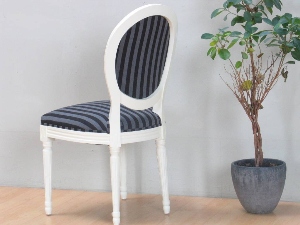 Eetkamertafel: Antiek wit, antiek gepatineerd. Stoelen met zwart gestreepte bekleding