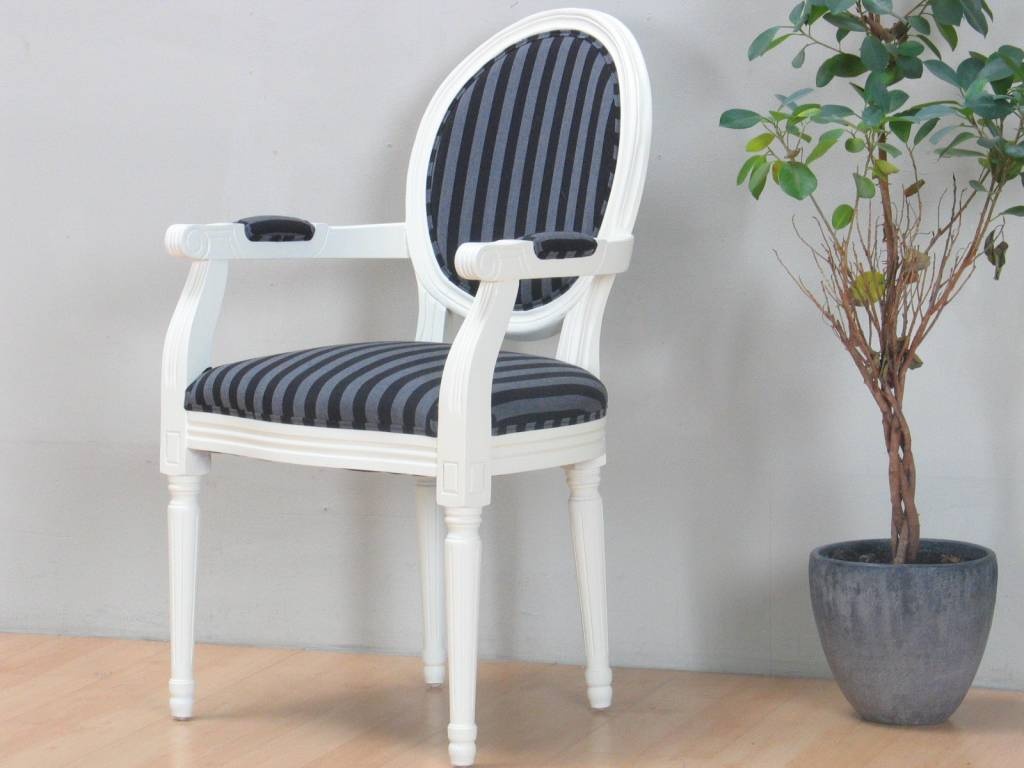 - Stoelen: massief hout, antiek wit gelakt en zwart gestreepte bekleding van katoen