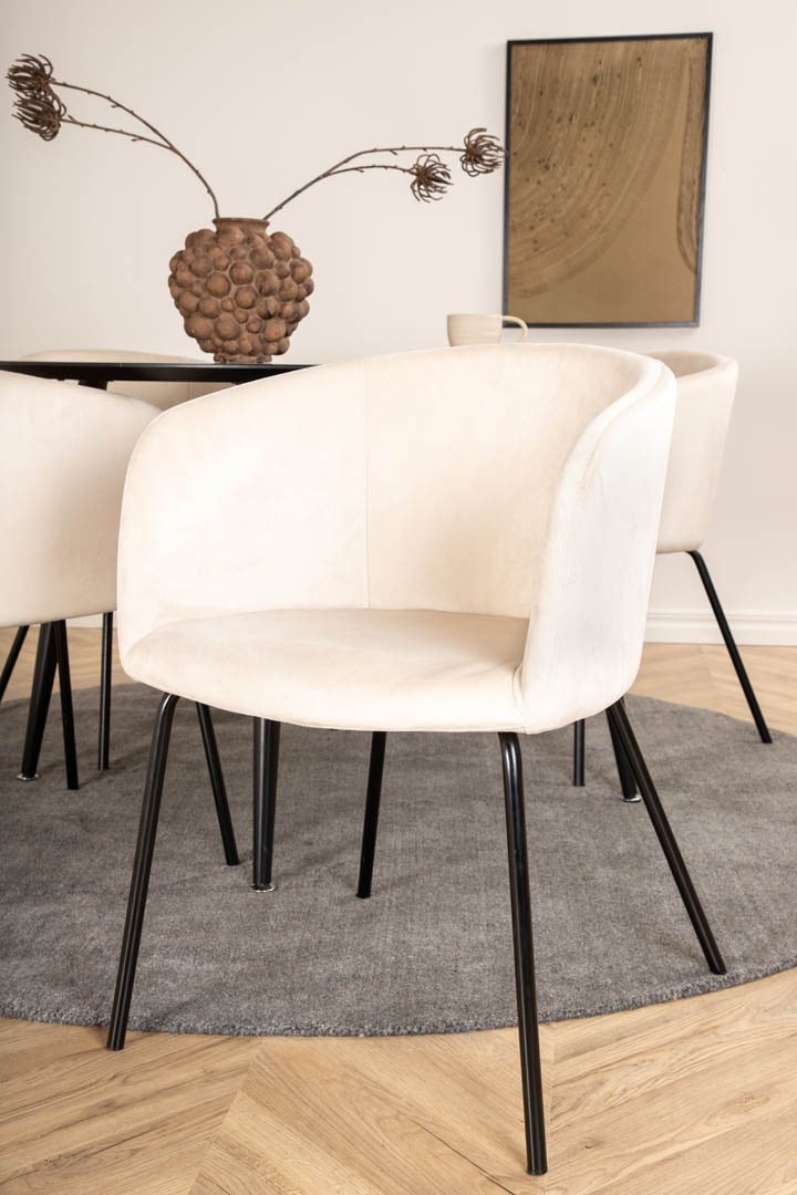 DippØ115BLBL eethoek eetkamertafel zwart en 4 Berit eetkamerstal velours beige. Dipp tafel 60-18101-888. Øcm 115. Tafel cm: L115 x D115 x H75. Tafel: elhout, MDF, staal . Berit stoel 60-15562-880. Aantal 4 . Met armleuningen. Stoel cm: B55 x H78 x D55. Zithoogte cm: 49. Zitdiepte cm: 45. Zitbreedte cm: 55. Maximaal gewicht kg.: 150. Stof. Velours. Stoel: 20% polyester linnen, 80% velours, ijzer .