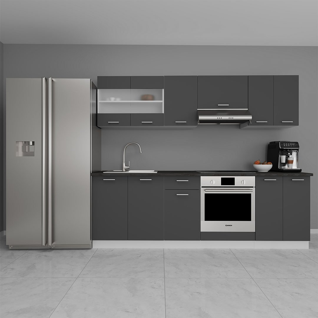 Esilo keukenopstelling , modulekeuken 240 cm wit, grijs. Beslag van robuust metaal. Corpus 16 mm dik. Incl. 16 verstelbare poten. Incl. plintstuk voor. Incl. plintstuk rechts. Incl. plintstuk links. Hoogte plintstuk 9,5 cm. Excl. werkblad. Excl. gootsteen en kraan. Excl. apparatuur. 8 Modules. Bovenkast 80 cm 2 glazen deuren B/H/D cm: 80x60x31. Onderkast 60 cm voor oven B/H/D cm: 60x82x46. Bovenkast 60 cm 2 deuren B/H/D cm: 60x60x31. Bovenkast 40 cm 1 deur B/H/D cm: 40x60x31. Bovenkast 60 cm 1 deur B/H/D cm: 60x40x31. Onderkast 80 cm voor gootsteen B/H/D cm: 80x82x46. Onderkast 60 cm 2 deuren B/H/D cm: 60x82x46. Onderkast 40 cm 1 deur, 1 lade B/H/D cm: 40x82x46. Je ontvangt meubels van een goede kwaliteit met een aangenaam comfort, gemaakt in een stijlvol en mooi design. Onze meubels zijn zeer aantrekkelijk geprijsd. Creëer uw eigen persoonlijke stijl met een nieuw meubel. Combineer met kleinmeubels of een paar mooie woonaccessoires. Hier verkrijg je de nieuwe woningtrends, zoals je ze in tijdschriften en magazines ziet. Bij ons vindt u unieke, praktische en comfortabele meubels met elk zijn eigen, mooi en apart design.