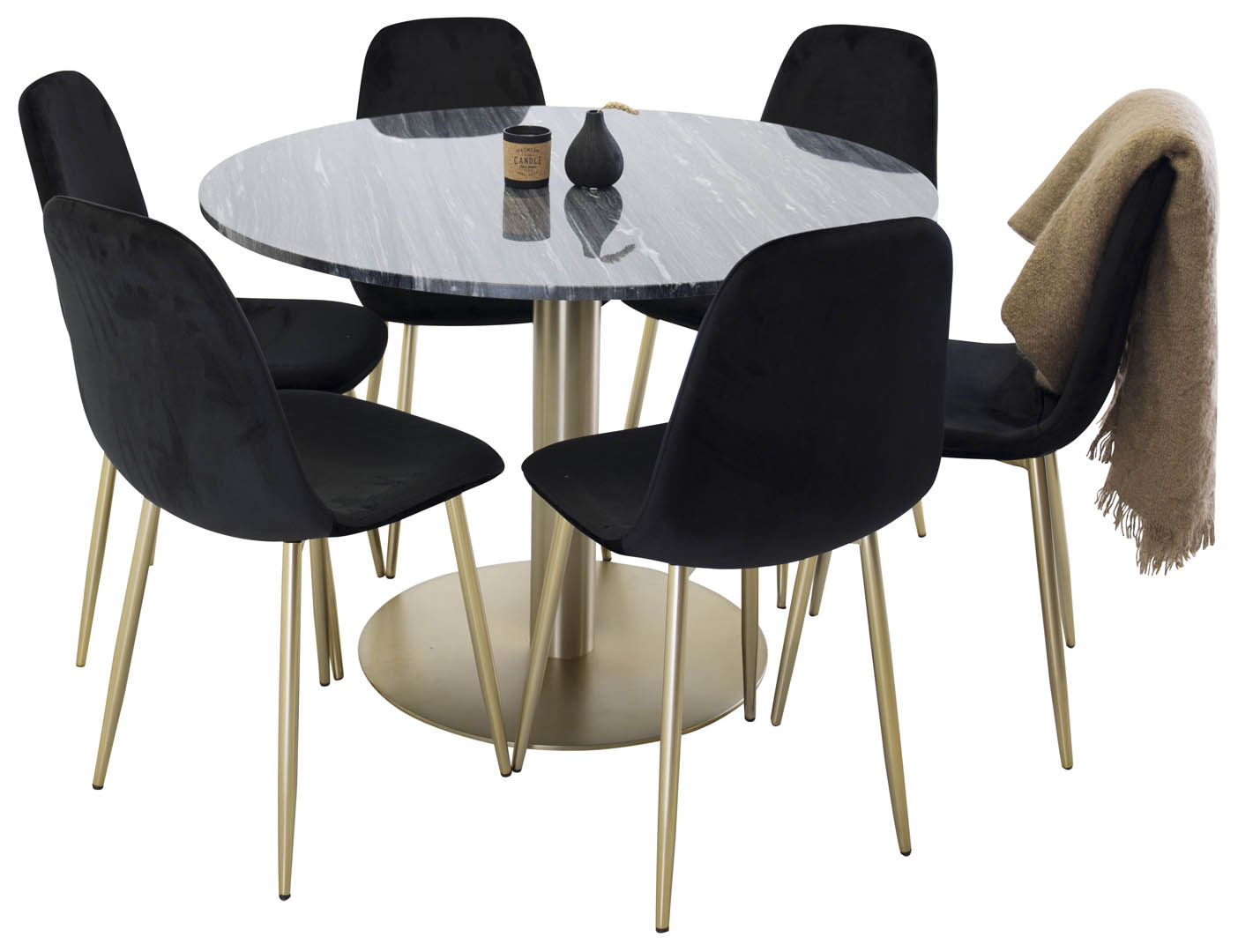 ebuy24 EstelleØ106BLBR eethoek eetkamertafel zwart, marmer en 6 Polar eetkamerstal velours zwart, messing decor.