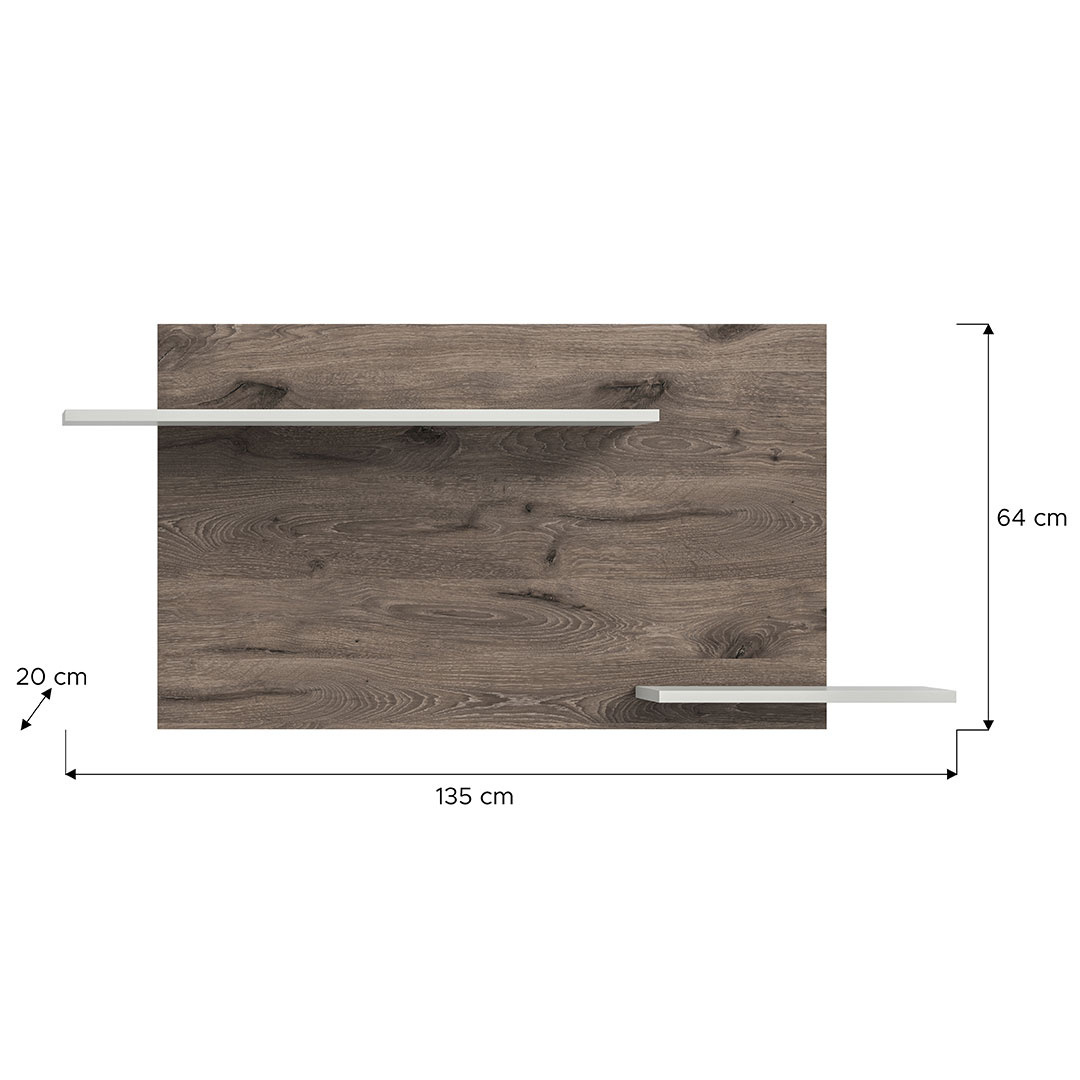 Falcona wandplank lichtgrijs. Deze prachtige wandplank combineert functionaliteit met een modern design dat perfect past in elke woonkamer, hal of slaapkamer. Het is ontworpen met twee zwevende planken die een stijlvolle uitstraling creëren. Het donkere houtkleurige achterpaneel geeft een natuurlijke, warme toon, terwijl de witte planken een helder en strak contrast creëren. De plank biedt zowel opbergruimte als decoratieve mogelijkheden voor het tentoonstellen van boeken, planten of kleine voorwerpen. Een elegant en praktisch meubelstuk dat een modern tintje aan uw huis kan geven.