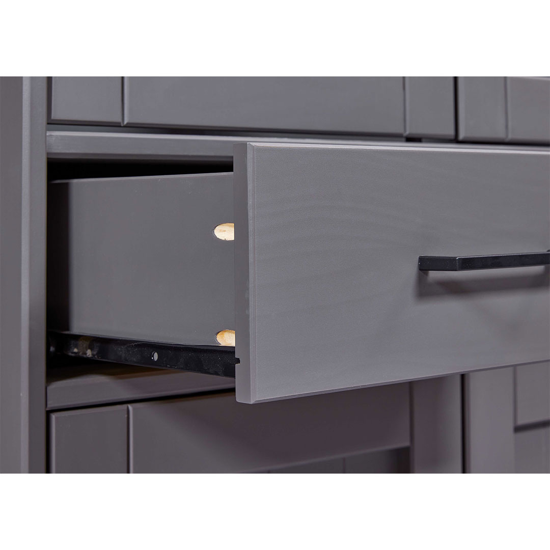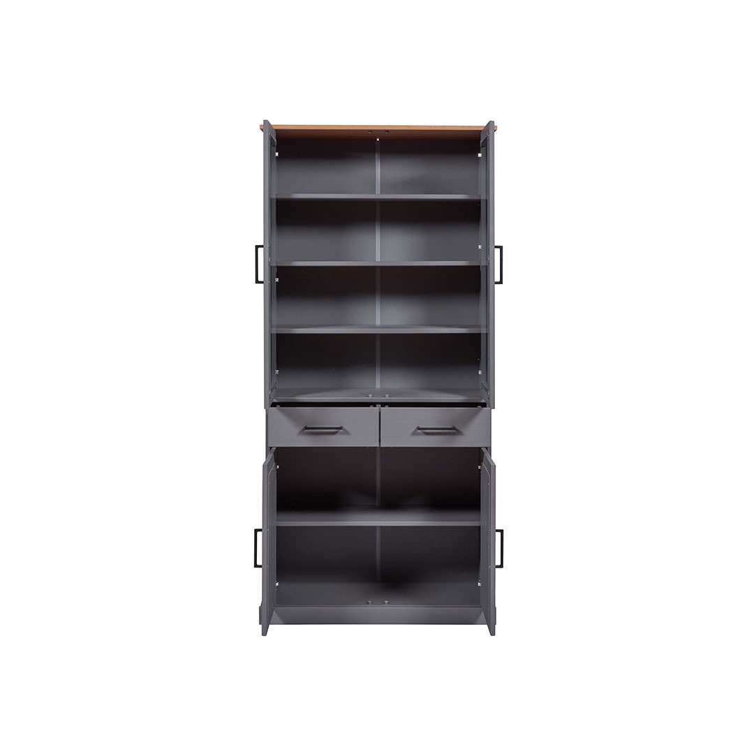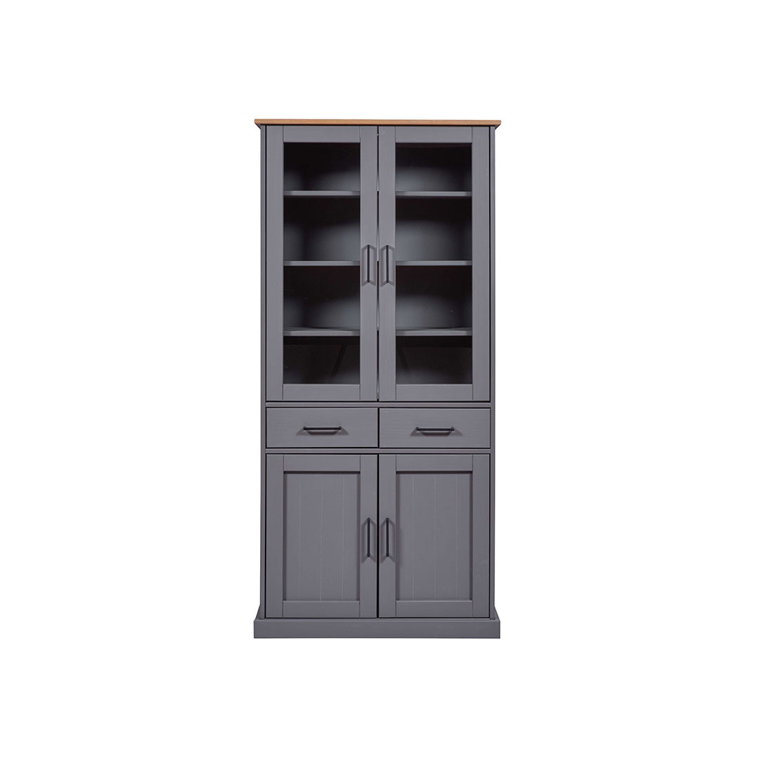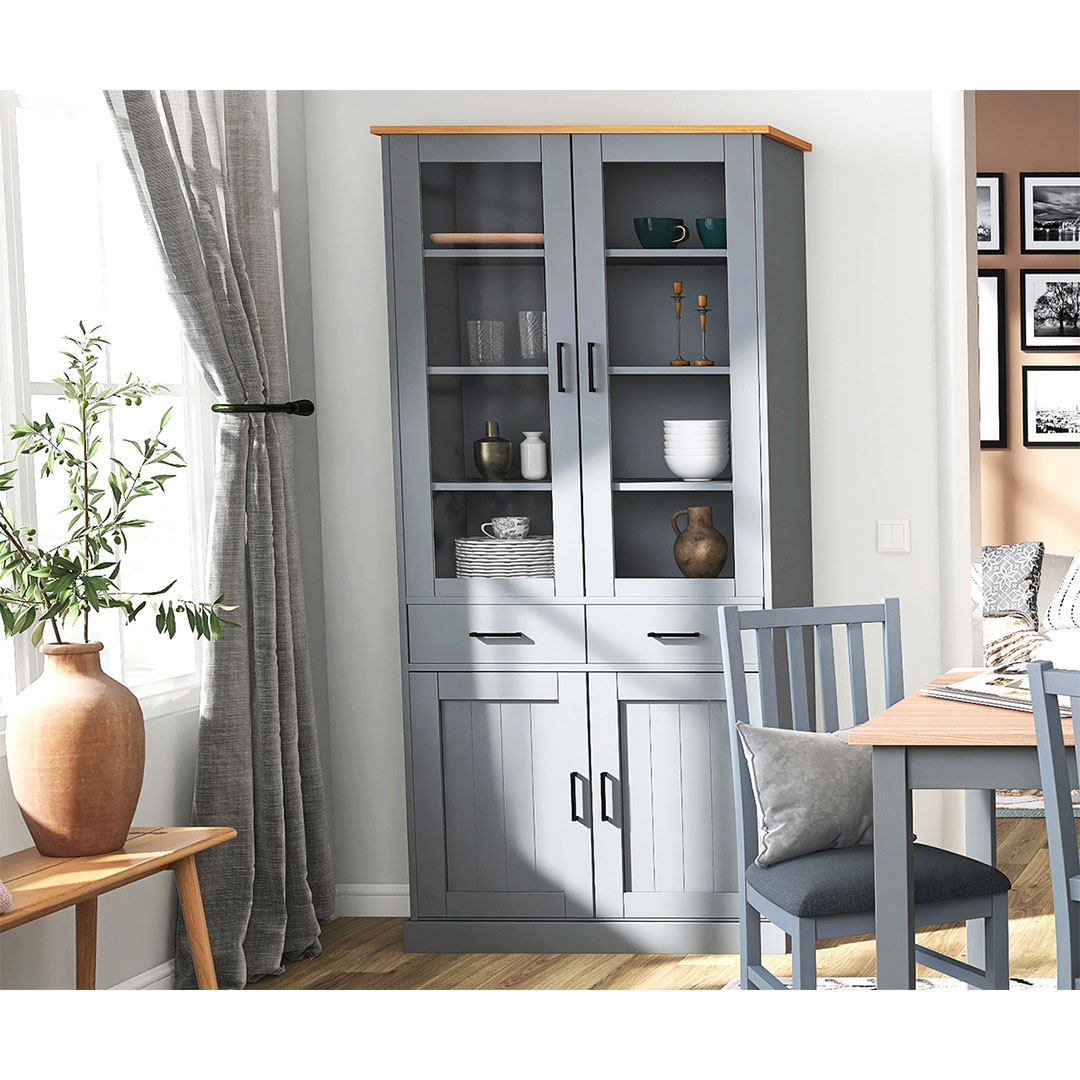 Forenzo vitrinekast 4 deuren, 2 lades grijs, naturel. De Forenzo vitrinekast is een elegante en functionele opbergoplossing die tijdloos design combineert met functionaliteit. Met zijn vier deuren en twee ruime lades biedt hij voldoende ruimte voor het opbergen en tentoonstellen van je favoriete spullen. Het bovenste gedeelte met glazen deuren maakt het gemakkelijk om serviesgoed, boeken of decoratieve voorwerpen tentoon te stellen, terwijl het onderste gedeelte met massieve deuren zorgt voor discrete opslag. Het mooie contrast van de kast tussen het warme blad en de grijze afwerking maakt hem tot een stijlvolle keuze voor zowel klassieke als moderne woningen. De Forenzo vitrinekast is het ideale meubelstuk om met elegantie orde te scheppen.