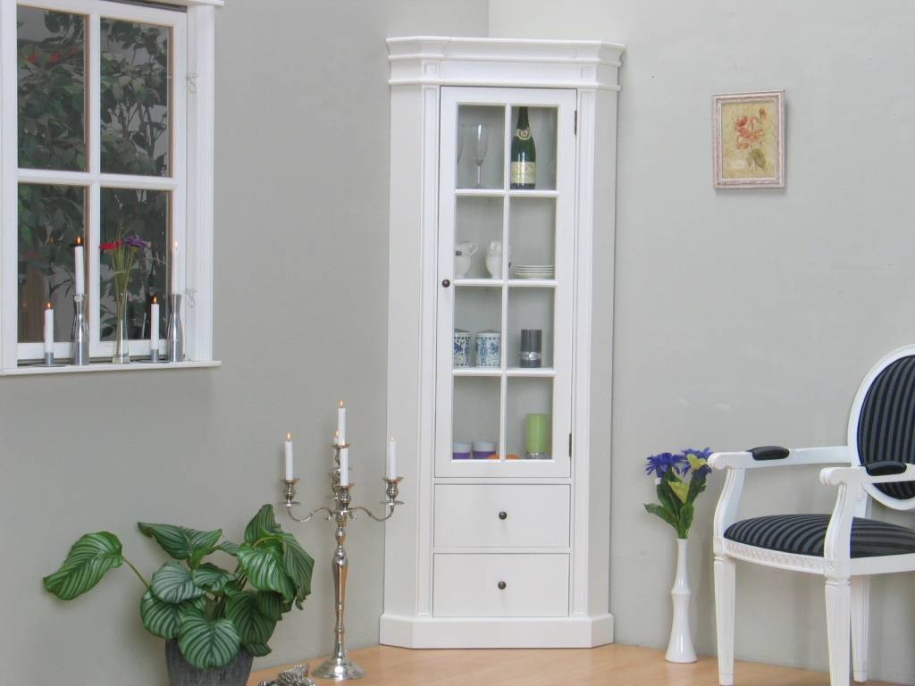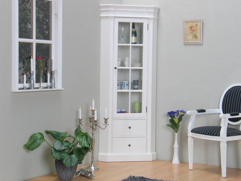 Mozart hoekvitrinekast in antiek wit, antiek gepatineerd. Breedt 55 cm, hoogte 200 cm.