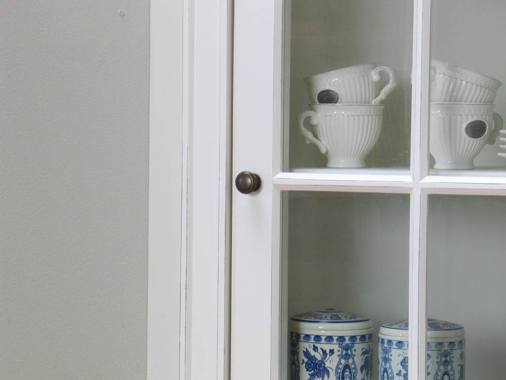 | Antiek wit gelakt massief hout, antiek gepatineerd, deuren met magneetfunctie en metalen grepen. |