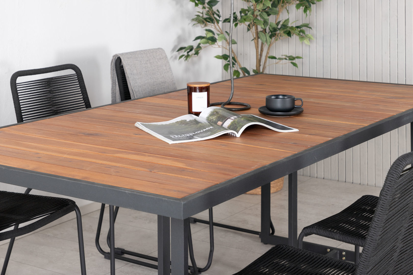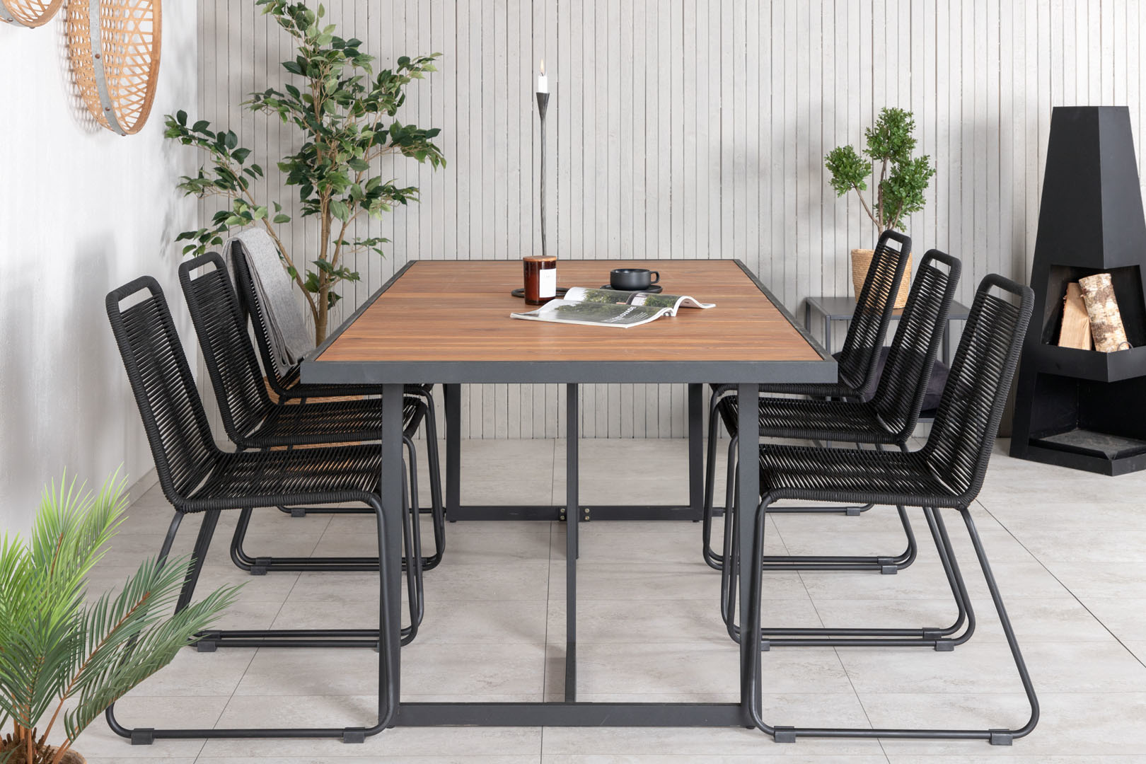 Khung tuinmeubelset tafel 100x200cm en 6 stoel stapel Lindos zwart, naturel. Tafel incl. extra borden: Nee. Lange tafel zonder extra bladen: cm . Lange tafel met extra bladen: cm. Tafel: B 100 x H 75 x L 200cm. Stoel: B 57 x H 86 x D 59cm. Zithoogte: 47cm. Zitdiepte: 40cm. Zitbreedte: 44,4cm. Hoogte armleuning: 0cm. Max gewicht stol: 150kg. Inclusief kussen: Nee. Stoel stapelbaar: Ja. Stoel instelbaar: Nee.