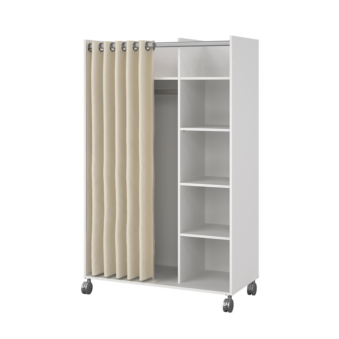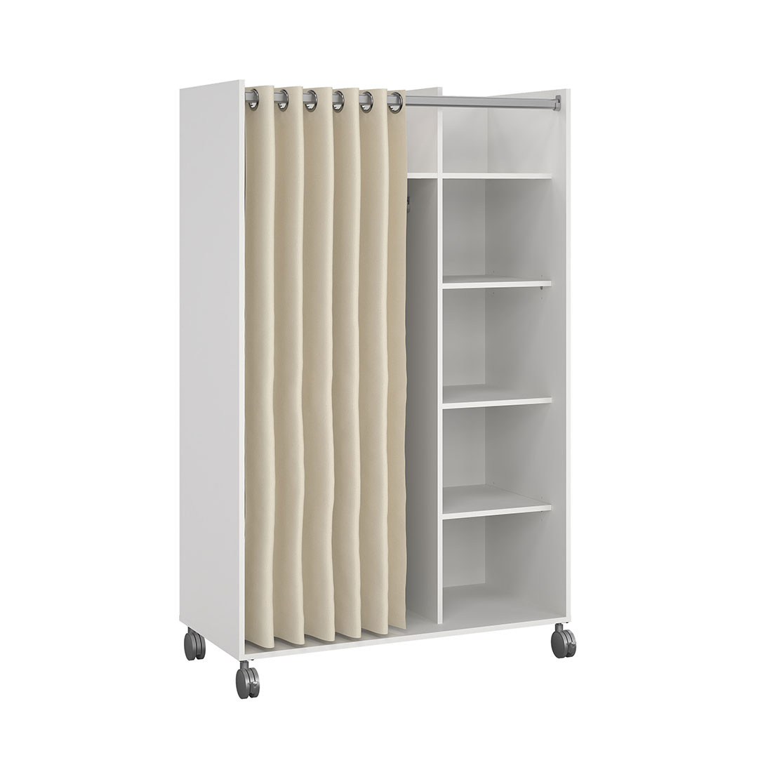 Kit kledingkast 160x100x49cm, open, kledingkastinzet wit, beige. De Kit kledingkast is een praktische en stijlvolle oplossing voor het opbergen van kleding en persoonlijke bezittingen. Door de open constructie kun je gemakkelijk bij je kleding, terwijl de kledingkastinzet met planken aan de ene kant en ophangruimte aan de andere kant veel flexibele opbergruimte biedt. De kast is uitgerust met een elegante beige gordijnoplossing die de opgeslagen inhoud kan afschermen en een strakke en georganiseerde uitstraling kan creëren. Dankzij de praktische wielen is de kast eenvoudig te verplaatsen als dat nodig is, waardoor hij ideaal is voor kleine ruimtes of voor situaties waarin flexibiliteit belangrijk is.