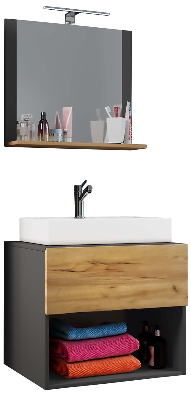 LendasII60 badkamer antraciet, eik decor. 2 delen. Incl. wasbak. Zonder kraan. Wastafel: H 52 x B 60 x T 52 cm. Zonder licht. Spiegel: H 55 x B 60 x T 17 cm. Je ontvangt meubels van een goede kwaliteit met een aangenaam comfort, gemaakt in een stijlvol en mooi design. Onze meubels zijn zeer aantrekkelijk geprijsd. Creëer uw eigen persoonlijke stijl met een nieuw meubel. Combineer met kleinmeubels of een paar mooie woonaccessoires. Hier verkrijg je de nieuwe woningtrends, zoals je ze in tijdschriften en magazines ziet. Bij ons vindt u unieke, praktische en comfortabele meubels met elk zijn eigen, mooi en apart design.
