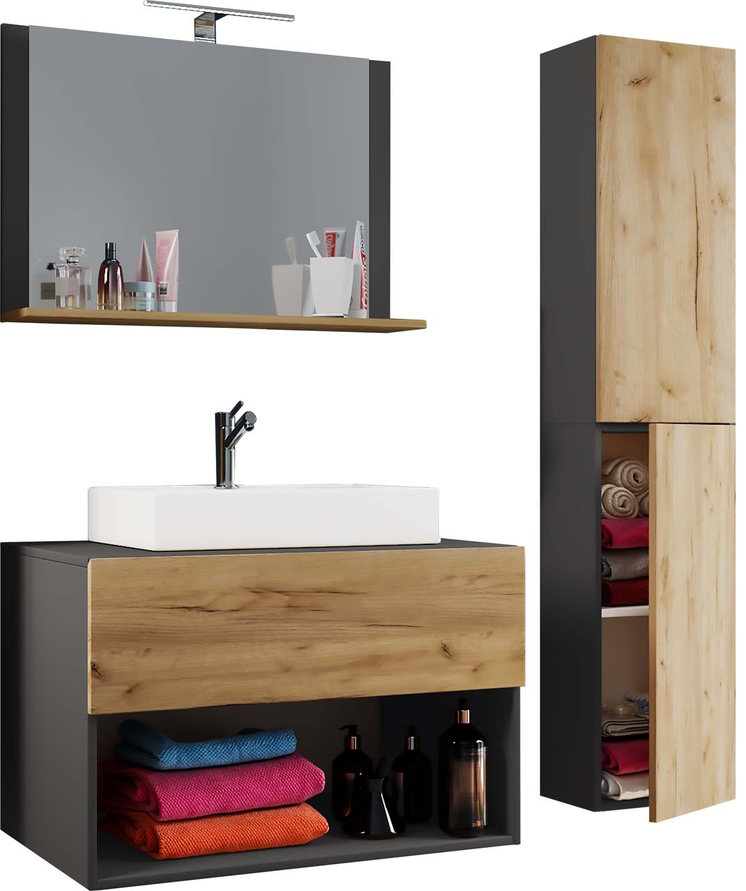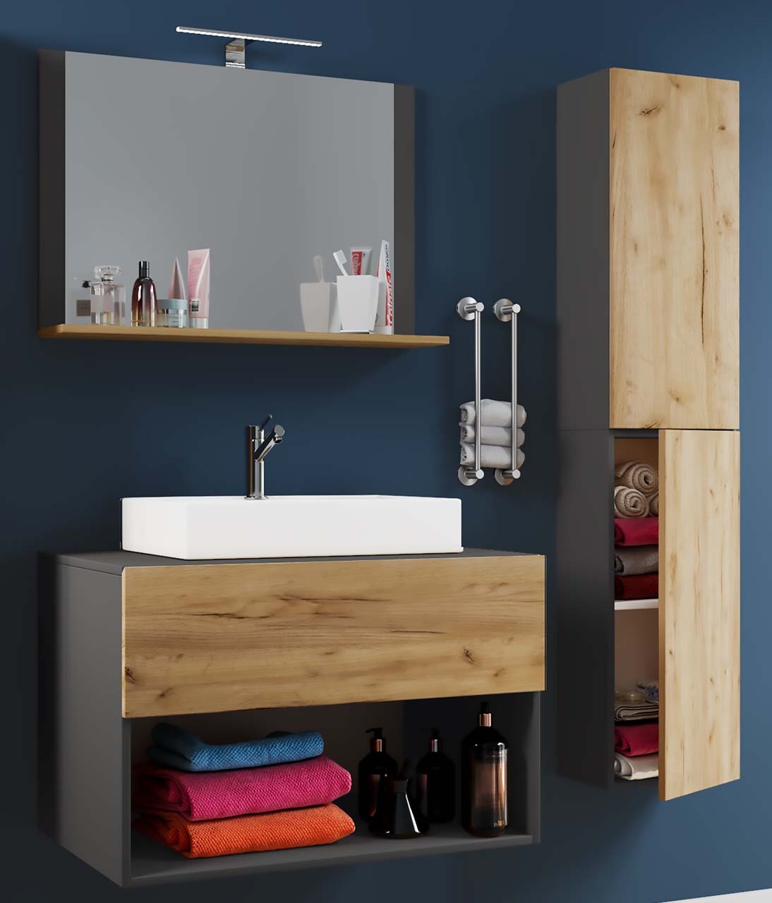 LendasII80 badkamer antraciet, eik decor. 3 delen. . Incl. wasbak. Zonder kraan. Wastafel: H 52 x B 80 x T 52 cm. Zonder licht. Spiegel: H 55 x B 80 x T 17 cm. Kolomkast: H 150 x B 33 x T 22 cm. Je ontvangt meubels van een goede kwaliteit met een aangenaam comfort, gemaakt in een stijlvol en mooi design. Onze meubels zijn zeer aantrekkelijk geprijsd. Creëer uw eigen persoonlijke stijl met een nieuw meubel. Combineer met kleinmeubels of een paar mooie woonaccessoires. Hier verkrijg je de nieuwe woningtrends, zoals je ze in tijdschriften en magazines ziet. Bij ons vindt u unieke, praktische en comfortabele meubels met elk zijn eigen, mooi en apart design.