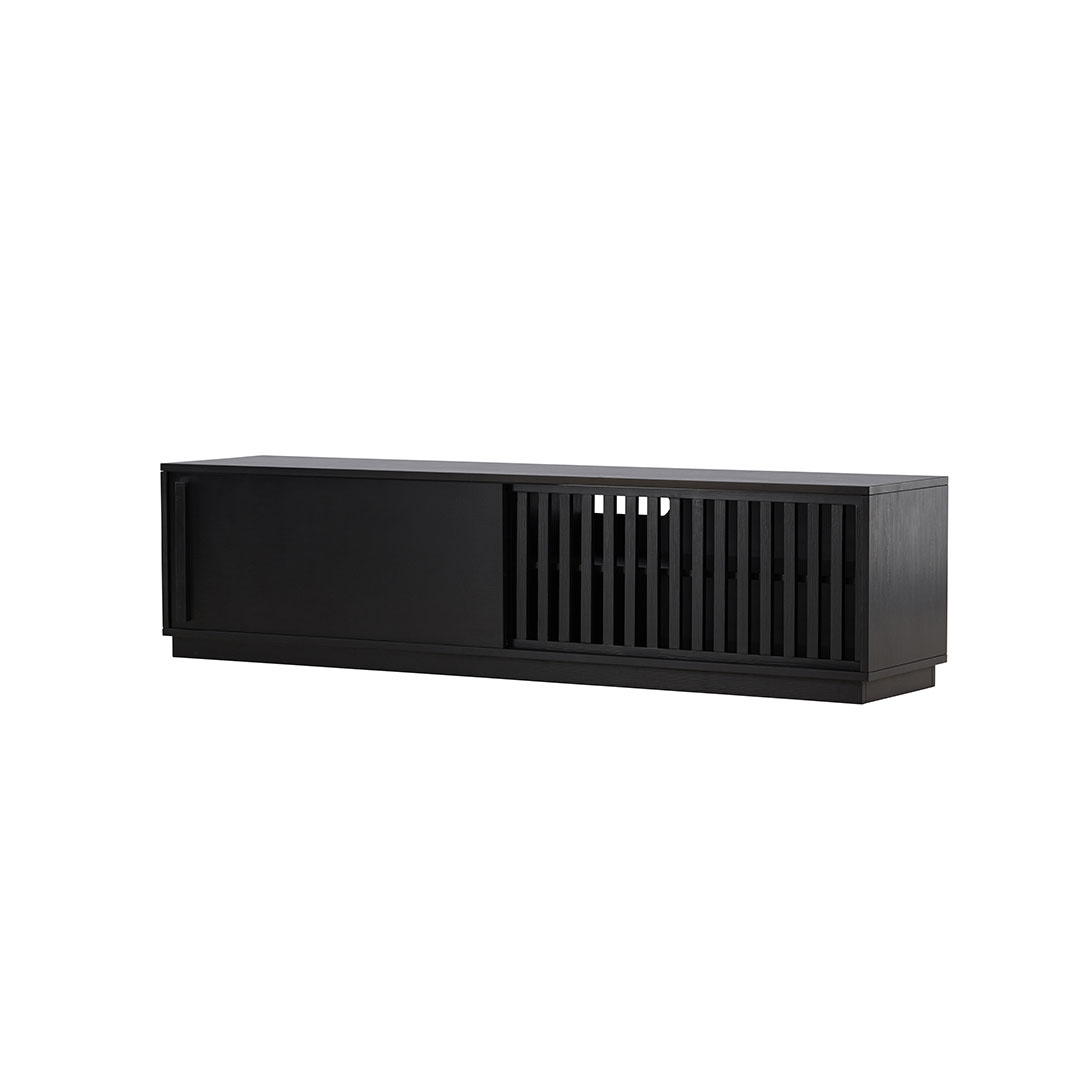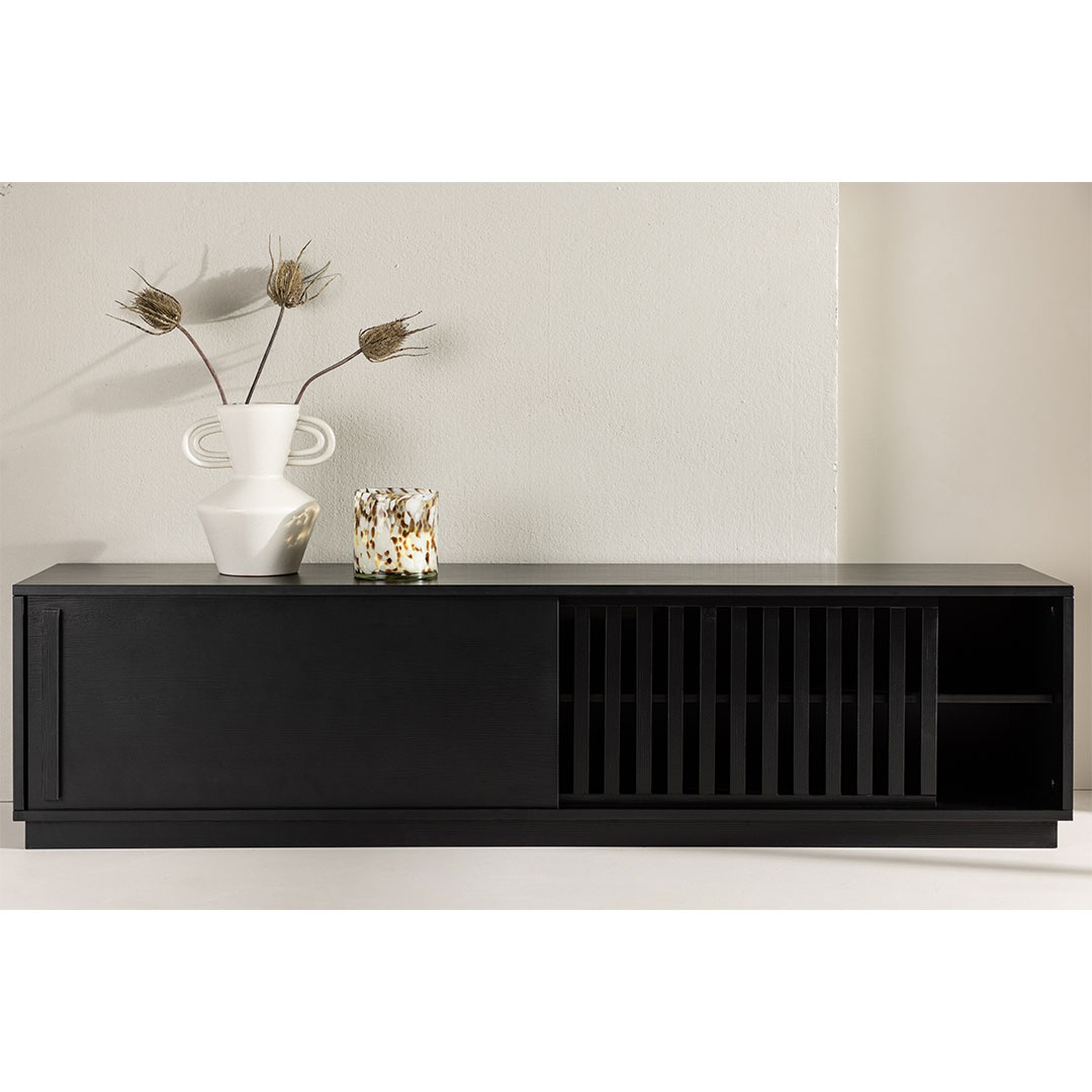 Lugo TV-meubel 2 deuren zwart is een TV-meubel in de kleur zwart dat zowel stijl als functionaliteit in uw huis brengt. Lugo TV-meubel 2 deuren zwart. Het Lugo tv-meubel in rokerig zwart is de perfecte combinatie van functionaliteit en esthetiek voor je woonkamer! Met een duurzaam melamine oppervlak in rokerig zwarte kleur biedt dit tv-meubel zowel slimme opbergruimte als een stijlvol ontwerp voor uw huis. Er is een volledig afdekkende deur aan de ene kant en een modern gegroefd roosterontwerp aan de andere kant. De volledig dekkende kastdeur is slim verstelbaar en kan worden verplaatst naar het gegroefde ontwerp als je liever een open ontwerp richting de plank hebt - jij beslist! Op de plank in het tv-meubel kun je gemakkelijk alle spullen opbergen die je wilt verbergen; kabels, afstandsbedieningen en al het andere dat je niet bij je wilt hebben. Je kunt er ook voor kiezen om het juiste schapniveau te decoreren met mooie items die je wilt laten zien. Versier het blad ook met je favoriete kandelaars en speakers om de perfecte sfeer te creëren voor je tv-kijkervaring. Het moet gezellig voelen om thuis te komen in de tv-hoek! Dit product is gemaakt met oog voor detail, wat zowel esthetische aantrekkingskracht als hoge duurzaamheid garandeert. Het is ontworpen met zowel functionaliteit als stijl in gedachten, waardoor het de perfecte keuze is voor elke kamer in uw huis. De gebruikte materialen zijn van hoge kwaliteit, waardoor het product een lange levensduur heeft en bestand is tegen dagelijks gebruik. Of het nu voor opslag is of als decoratieve toevoeging, dit product zal uw interieur naar een hoger niveau tillen en extra comfort en elegantie in uw huis brengen.
