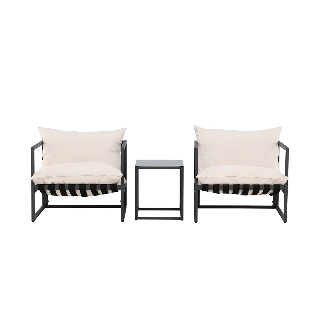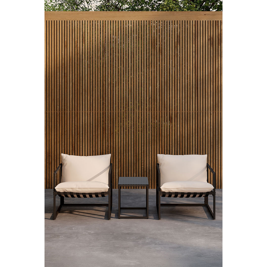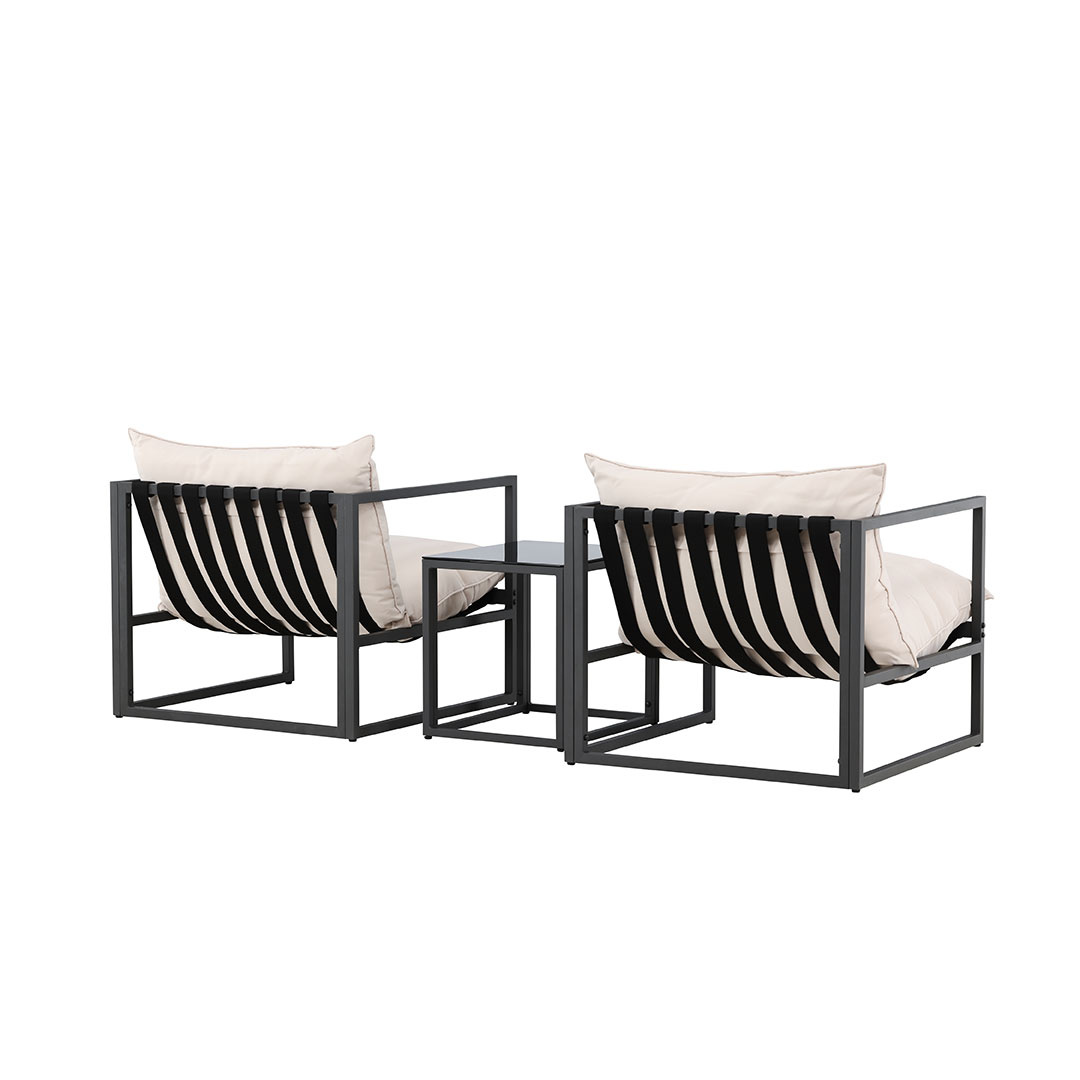 De Messina loungeset in de kleur zwart is ontworpen om een stijlvolle en comfortabele buitenloungeplek te creëren. De set bestaat uit twee stoelen en een bijzettafel, wat zowel functionaliteit als elegantie biedt. De tafel meet H45xB40xD50 cm en biedt praktische opbergruimte voor drankjes of kleine spullen. De stoelen hebben een afmeting van H61xB75xD75 cm en de brede zitting en zachte kussens zorgen voor een comfortabele zitervaring. Het zwarte frame en de lichte kussens geven een tijdloze en moderne uitstraling die perfect past bij zowel moderne als klassieke buiteninrichting. De Messina loungeset is ideaal voor het creëren van een ontspannende en uitnodigende buitenruimte.