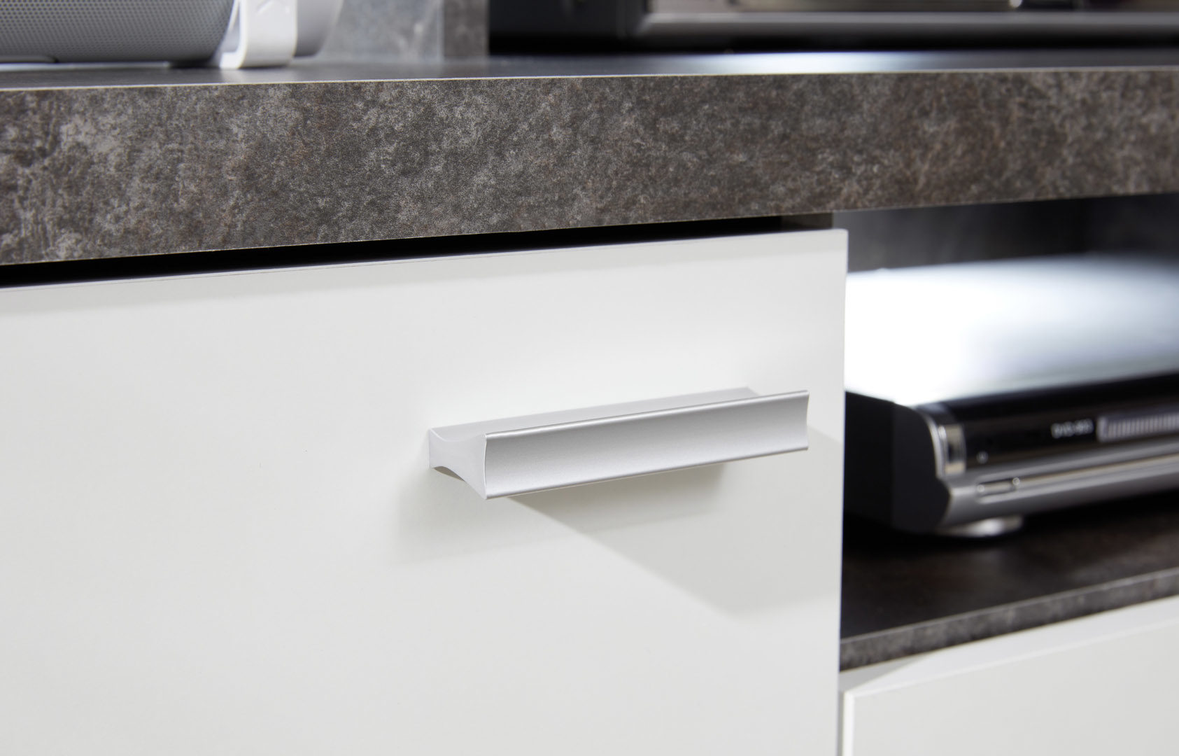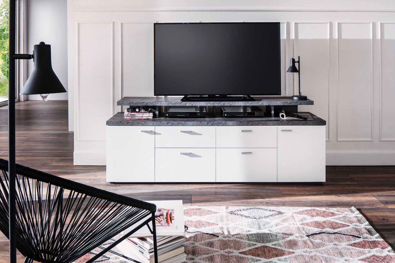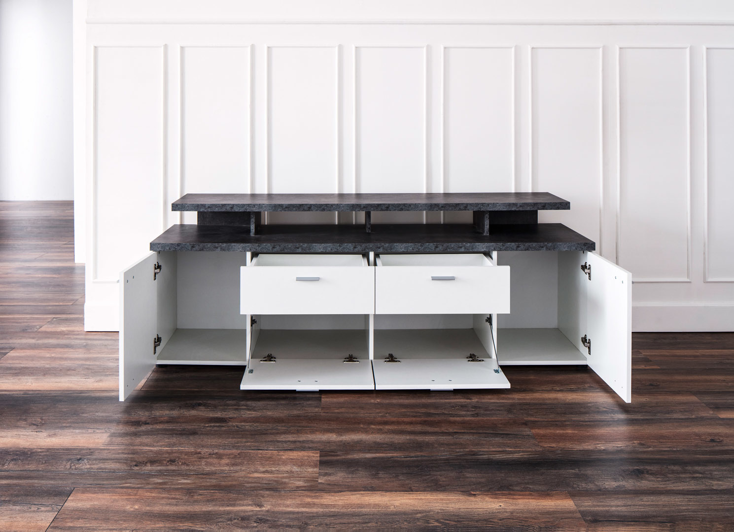 Mood TV-meubel 2 deuren, 2 laden, 4 open vakken, 2 kleppen wit, stenen decor.
