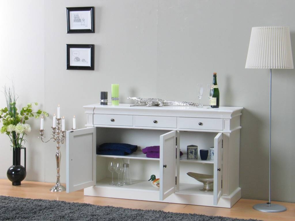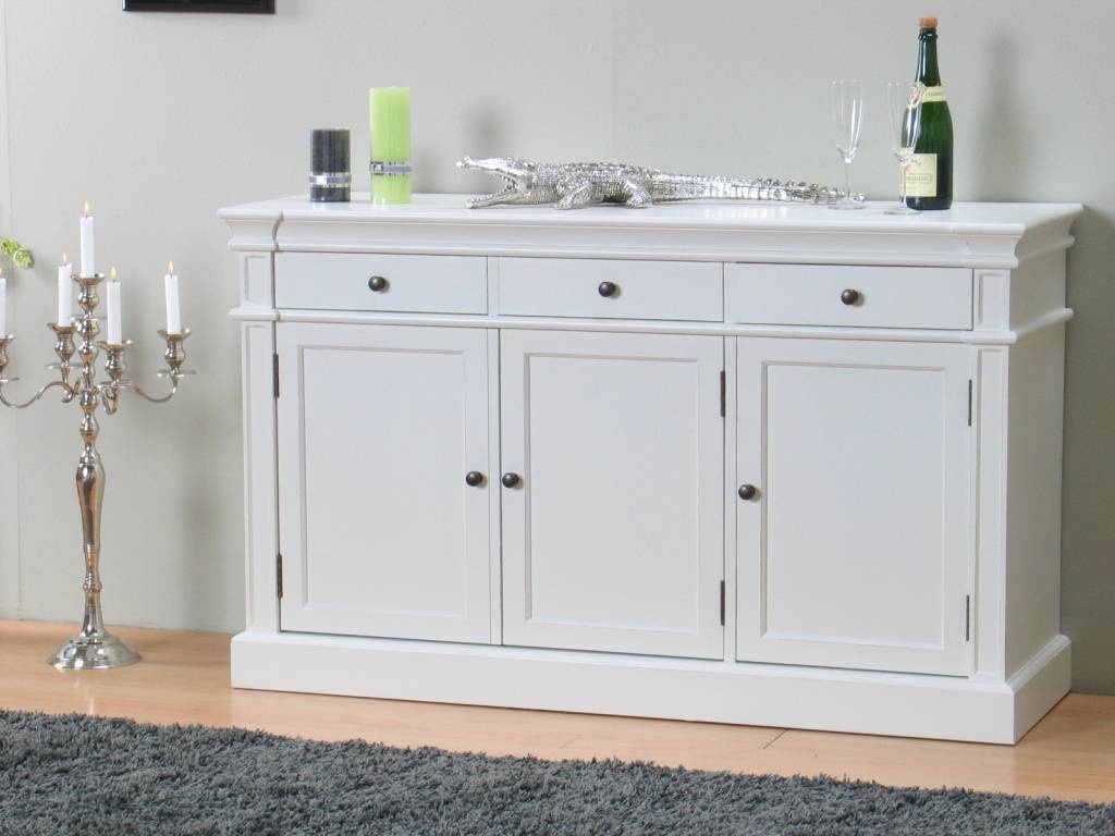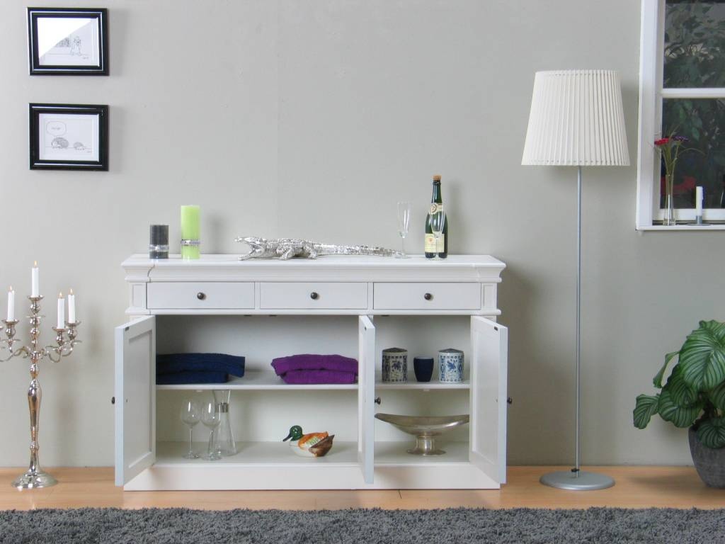 Mozart dressoir antiek wit, antiek gepatineerd met drie deuren en drie lades breedte 142 cm, hoogte 86 cm.