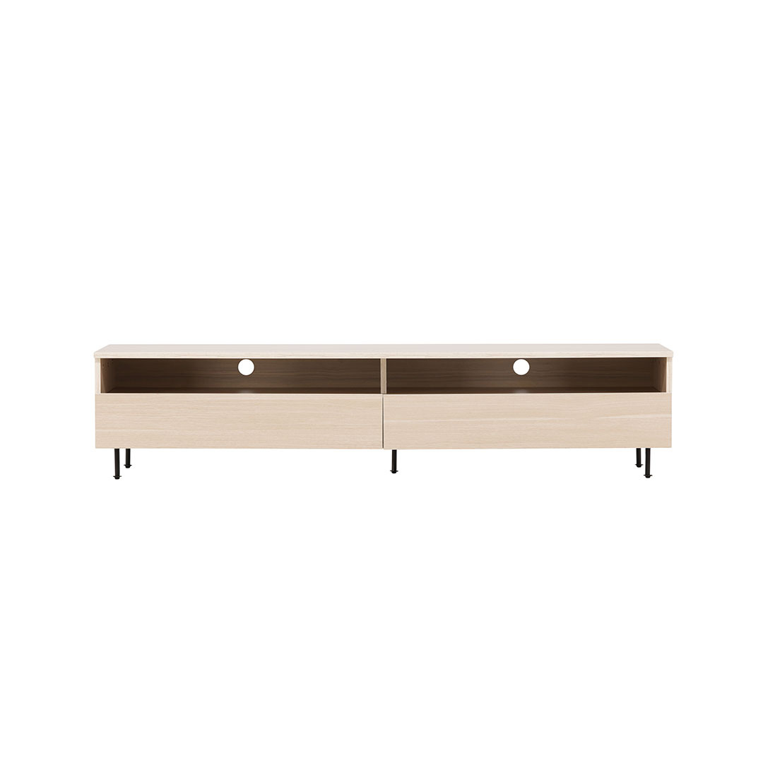 Navarra TV-meubel 2 lades 2 planken white wash is een TV-meubel in de kleur Whitewash, dat zowel stijl als functionaliteit in uw huis brengt. Navarra TV-meubel 2 lades 2 planken white wash. Richt je woonkamer in Scandinavische stijl in met onze luxe witgekalkte tv-tafel uit de serie Navarra! Dit prachtige meubelstuk met een duurzaam oppervlak van witgekalkte melamine maakt indruk met zijn moderne stijl en slimme opbergoplossingen. Het heeft twee ruime lades, perfect om alles discreet op te bergen, van afstandsbedieningen tot favoriete boeken. De open planken hierboven geven je de flexibiliteit om mooie spullen tentoon te stellen of de meest gebruikte spullen binnen handbereik te houden. Creëer dan je eigen harmonie door het blad te versieren met prachtige kandelaars en geweldige speakers voor een complete tv-ervaring. Dit tv-tafeltje staat op vier smalle poten in de kleur zwart die hem naar een stijlvol niveau tillen. Maar de hoogte van het tv-tafeltje geeft niet alleen je interieur een boost, het maakt ook je schoonmaakroutine gemakkelijker, de stofzuiger schuift er gemakkelijk onder en houdt de woning schoon. Hier haal je echt een tv-tafel in huis die tijdloos design combineert met slimme opbergers . Ervaar elke dag een gevoel van rust en georganiseerde luxe en creëer samen met Navarra uw eigen zithoek voor een complete tv-hoekoplossing!