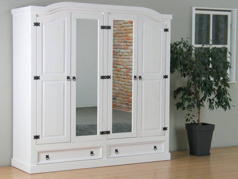 New Mexico 4-deurs kledingkast wit met spiegel. Een heel uitnodigende kledingkast van wit grenenhout, met 4 deuren en een spiegel. ...Lees uitgebreide product informatie