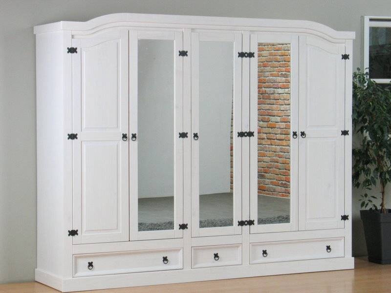 - Deze grote kledingkast heeft maar liefst 3 spiegeldeuren en 2 grenen deuren. Achter de 2 deuren links en rechts vind je een kledingroede voor al je kleerhangers, en een hoedenplank met legruimte, net als op de bodem. Achter de middelste deur bevinden zich 1 vaste en 2 losse legplanken voor extra truien bijvoorbeeld.