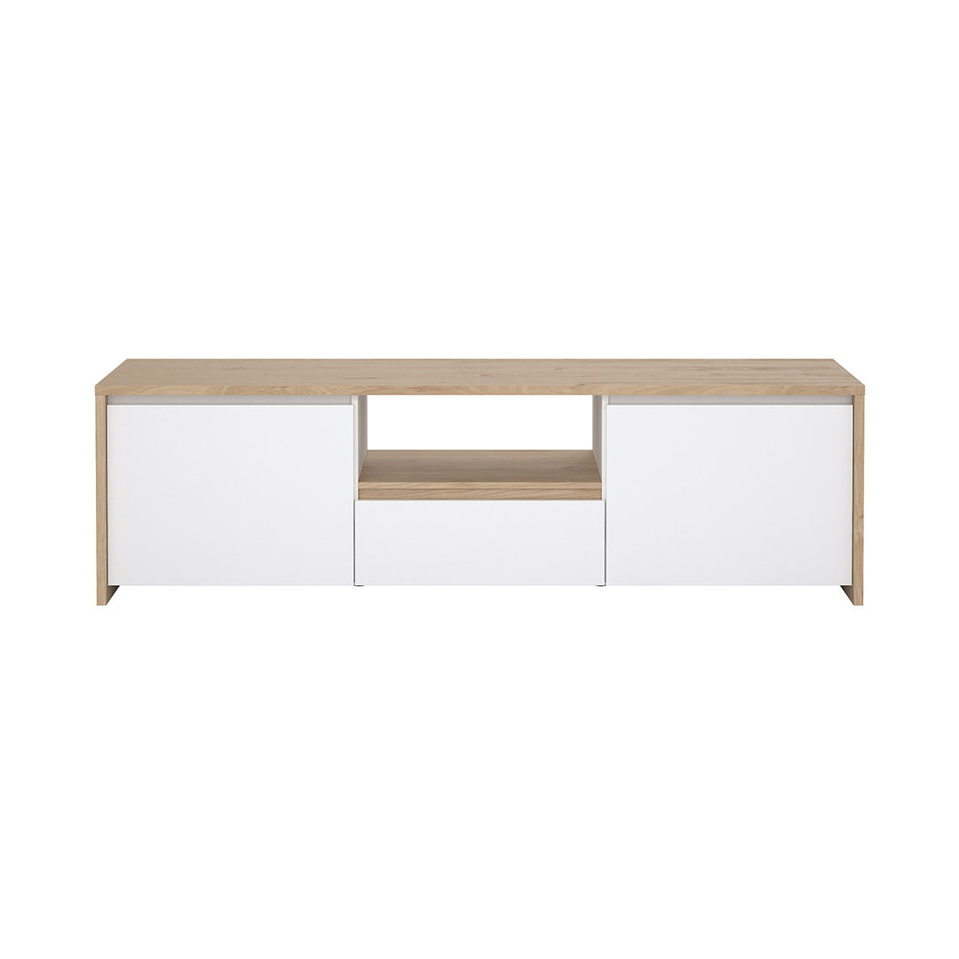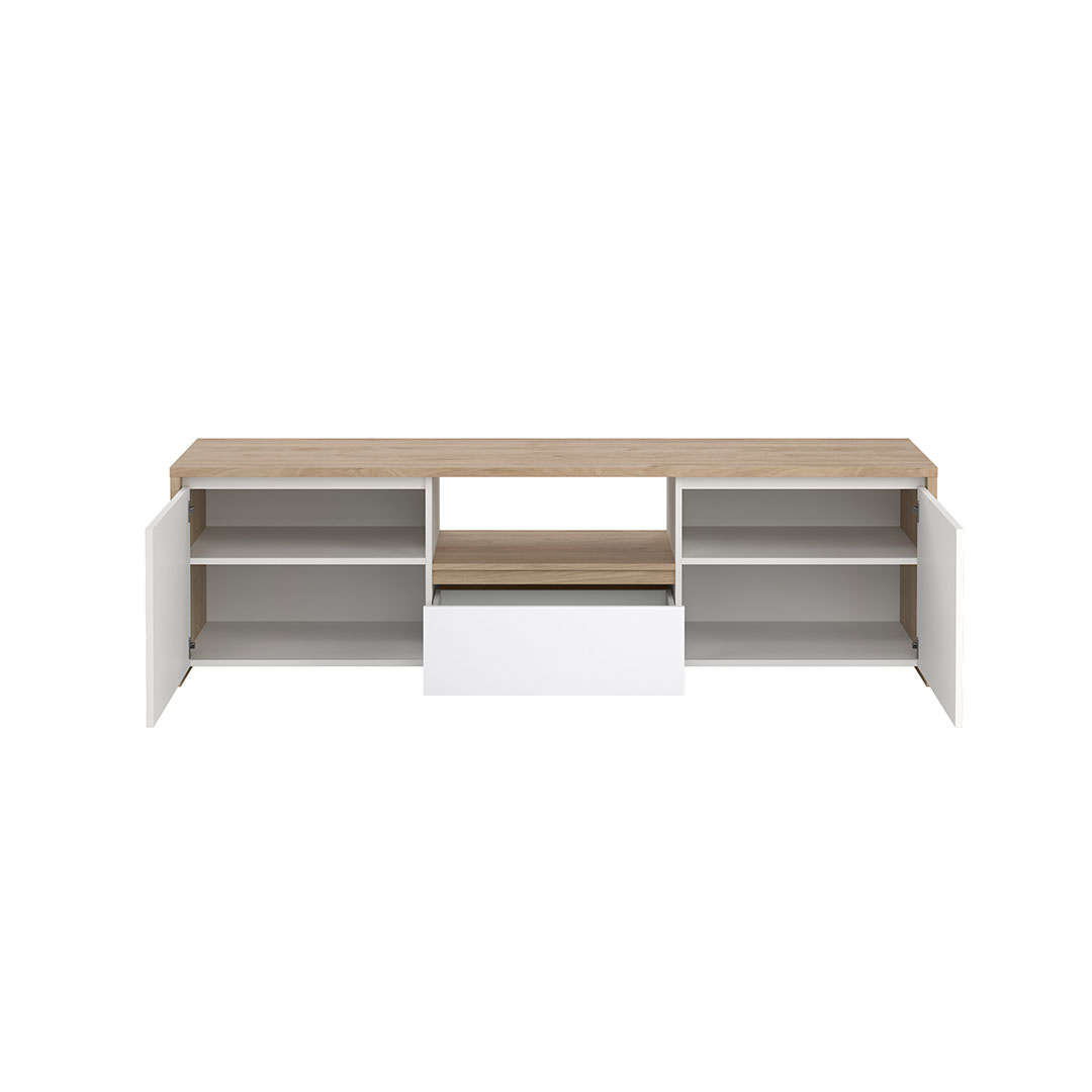 Next TV-meubel 2 deuren, 1 lade, 1 plank, eiken decor, wit hoogglans. Next TV-meubels zijn de ideale oplossing voor het organiseren van uw entertainmentruimte en geven uw huis een stijlvolle en moderne uitstraling. Met een combinatie van eiken decor en wit hoogglans krijg je een meubelstuk dat niet alleen functioneel is, maar ook elegant oogt in elke woonkamer. Het meubel heeft twee deuren, één lade en een open plank, waardoor je voldoende opbergruimte hebt voor zowel elektronica als diverse accessoires. Het gladde oppervlak en de lichte, moderne lijnen zorgen ervoor dat het perfect past in moderne interieurs. Of u nu uw tv-apparatuur, films of andere kleine spullen opbergt, Next TV-meubels houden uw ruimte georganiseerd en stijlvol.