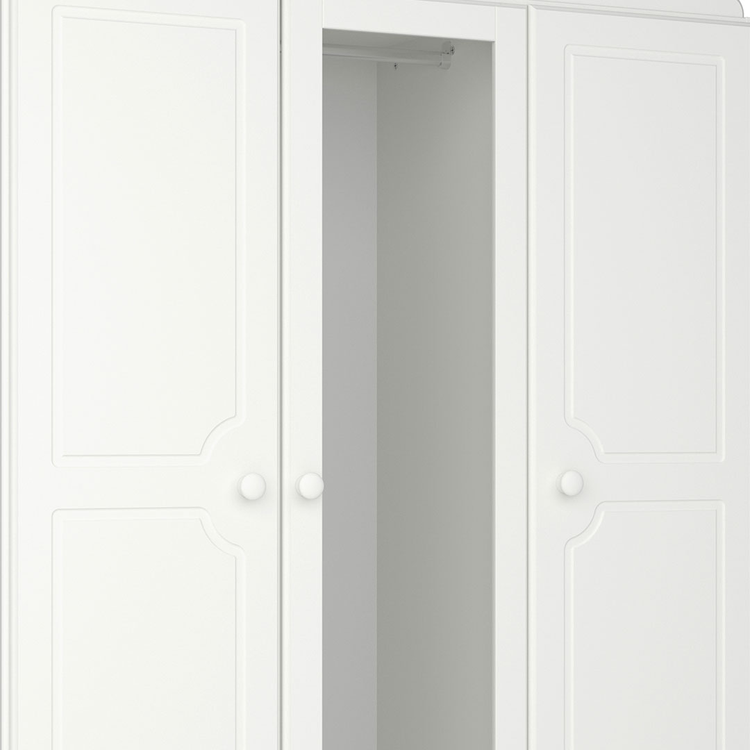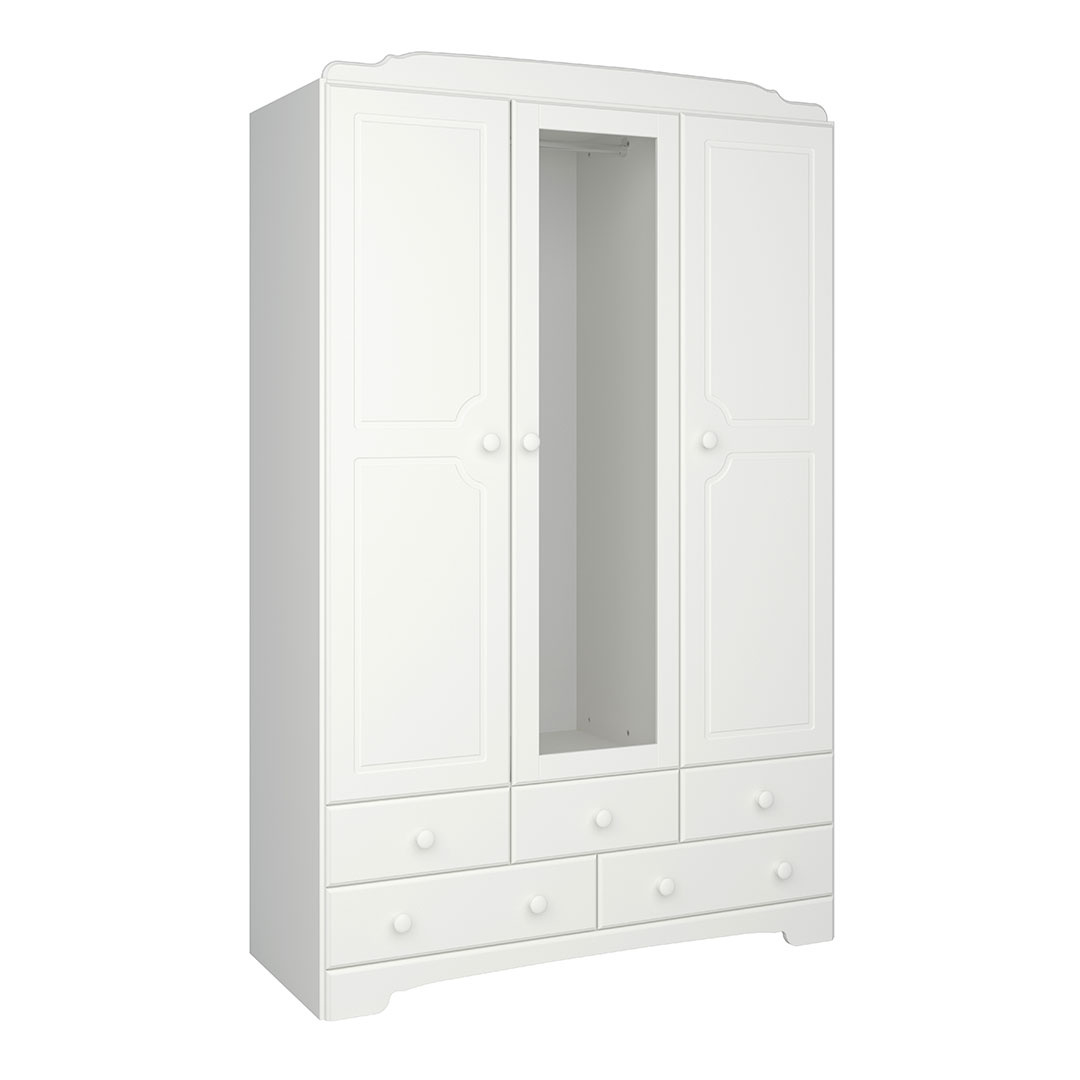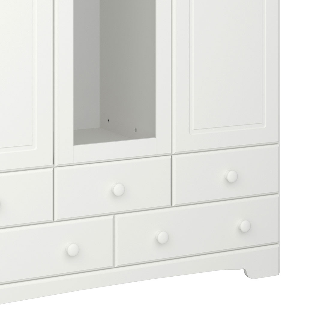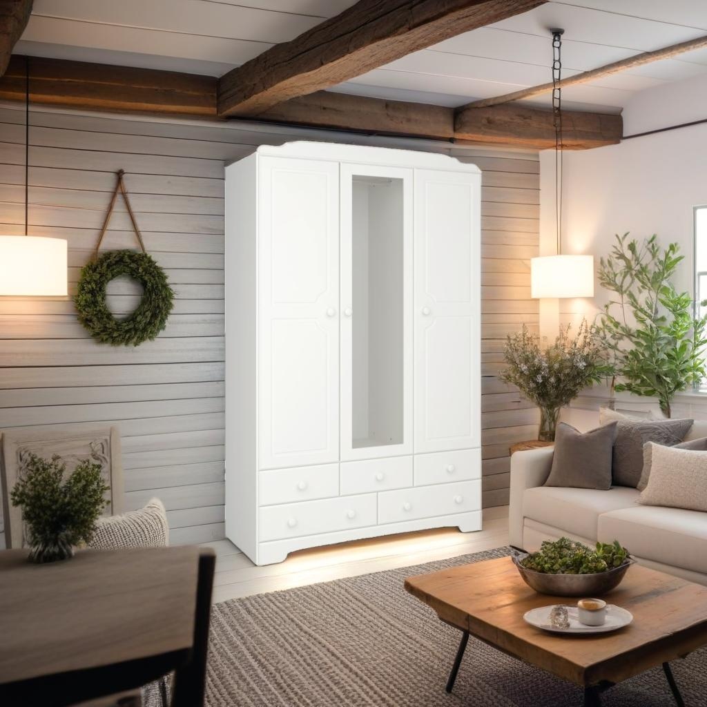 De nylon kledingkast met drie deuren en vijf lades is de perfecte keuze voor zowel stijlvolle als praktische opbergruimte. De kast heeft twee aparte secties met kledinghangers: een breed gedeelte voor het ophangen van langere kleding en een kleiner gedeelte voor overhemden, jassen of andere spullen. De vijf ruime lades bieden extra ruimte voor het opbergen van alles, van beddengoed en kleding tot kleine spullen en accessoires.Het tijdloze design met elegante paneeldetails en functionele handgrepen maakt het eenvoudig om de kast in elke woning te integreren. De solide constructie zorgt voor stabiliteit en duurzaamheid, terwijl de compacte en doordachte indeling de kast ideaal maakt voor zowel kleine als grote ruimtes.