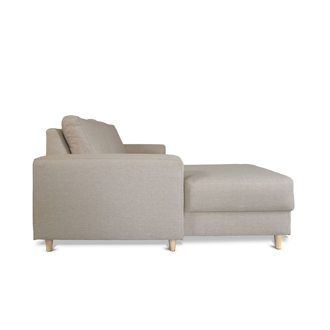 Nordic bank met chaise longue links gericht licht beige. Hoes Rating "colour fastness to light": 5. Hoes Rating "pilling": 4-5."Pilling", Opvulling van de stof, gaat van 0-5, waar 5 het beste is. "Colour fastness to light", Kleurechtheid, gaat van 1-8, waar 8 het beste is. Scandinavische bank met chaise longue naar links gericht - Lichtbeige. Creëer een comfortabel en stijlvol ontmoetingspunt in uw huis met de Scandinavische bank met naar links gerichte chaise longue in lichtbeige. Deze ruime bank biedt ruimte voor het hele gezin en is perfect voor zowel ontspanning als gezellig samenzijn. De zitting is opgevuld met PU-schuim, wat zorgt voor een stevige en stabiele ondersteuning, terwijl de rugkussens, gevuld met korrels, zorgen voor een zachter en meer ontspannend comfort voor de rug.Met het royale formaat en de chaise longue krijg je een bank waar je achterover kunt leunen en kunt genieten van een rustig moment of vrienden kunt uitnodigen voor aangename momenten. De grote Scandinavische bank heeft een klassieke vorm waardoor hij gemakkelijk in elke woning past, en de strenge poten steken mooi af tegen de rechte lijnen van de bank, wat een opvallende en consistente totaalindruk creëert.De Scandinavische bank met chaise longue is ideaal voor het creëren van een warme en uitnodigende ruimte en past perfect in de meeste huizen. U kunt de variant kiezen die het beste bij uw interieurstijl past of u nu de voorkeur geeft aan een strakke, stoere uitstraling of een warmere en klassiekere uitstraling. Welke variant u ook kiest, de Nordic bank zal een stijlvolle en functionele toevoeging aan uw huis zijn, die zowel opvallend als comfortabel is.