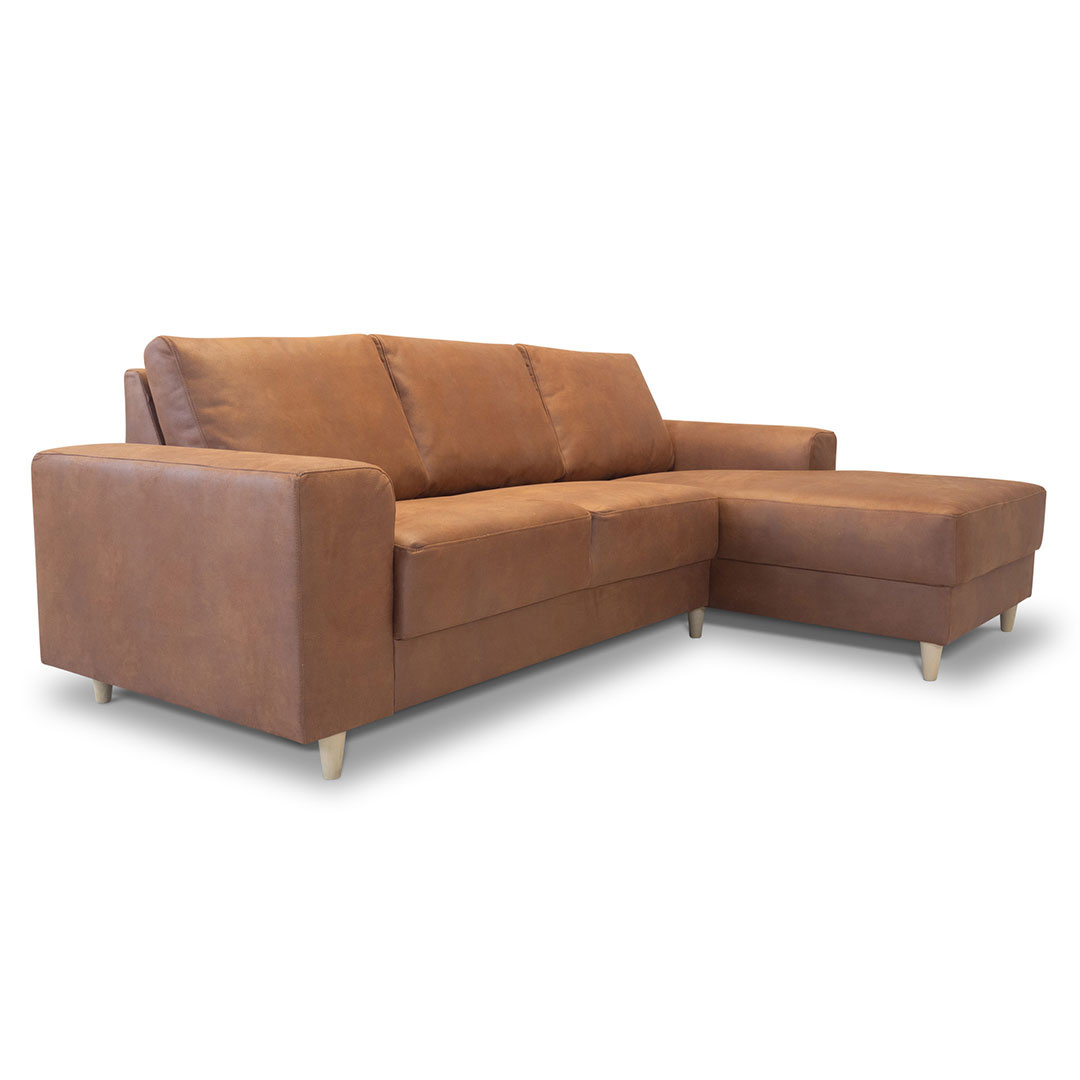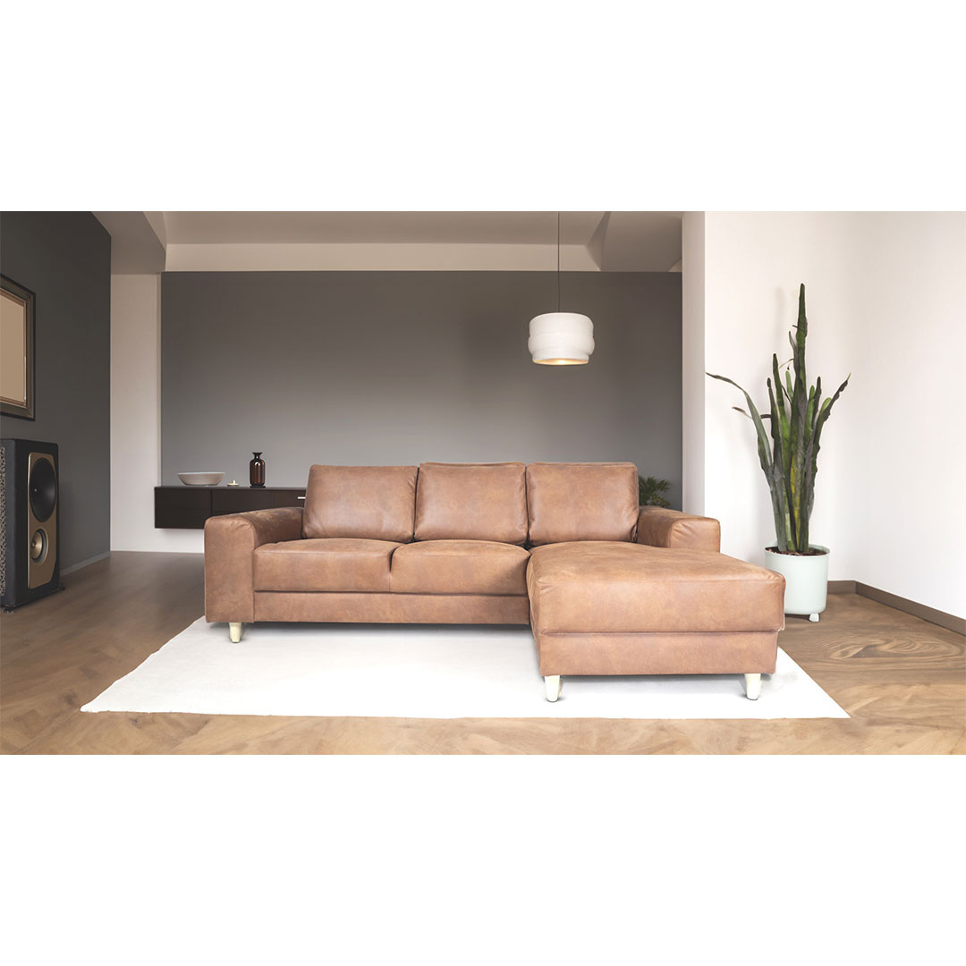 Nordic bank met chaise longue rechts gericht cognackleurig leer. Hoes Rating "colour fastness to light": 4. Hoes Rating "pilling": 4-5."Pilling", Opvulling van de stof, gaat van 0-5, waar 5 het beste is. "Colour fastness to light", Kleurechtheid, gaat van 1-8, waar 8 het beste is. Scandinavische bank met chaise longue naar rechts gericht - Cognackleurig leer. Voeg een warme en luxueuze sfeer toe aan je huis met de Scandinavische bank met naar rechts gerichte chaise longue in cognackleurig leer. Deze ruime bank is perfect voor het hele gezin en vormt een ideaal ontmoetingspunt voor zowel ontspanning als gezellige bijeenkomsten. De zitting is opgevuld met PU-schuim, wat zorgt voor een stevige en stabiele ondersteuning, terwijl de met korrels gevulde rugkussens de rug zachter en comfortabeler ondersteunen.Met de Nordic bank krijg je voldoende ruimte om je uit te strekken en geconcentreerd te genieten van ontspanning of om vrienden uit te nodigen voor een leuke tijd. De klassieke vorm en strakke poten van de bank, die mooi afsteken tegen de rechte lijnen, geven een opvallende en doorlopende totaalindruk die perfect past in de meeste woningen.De cognackleurige lederen variant geeft een warme en uitnodigende uitstraling die gemakkelijk kan worden aangepast aan verschillende interieurstijlen. Of je nu een strakke, stoere uitstraling wilt of juist een warmere en klassiekere uitstraling, deze bank zorgt voor de gewenste sfeer in huis. De Nordic bank is zowel functioneel als esthetisch aantrekkelijk een perfecte aanvulling op een huis dat zowel stijl als comfort moet uitstralen.