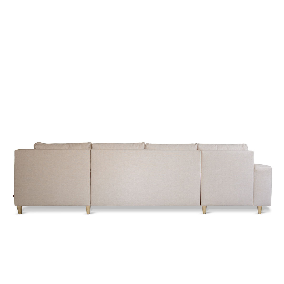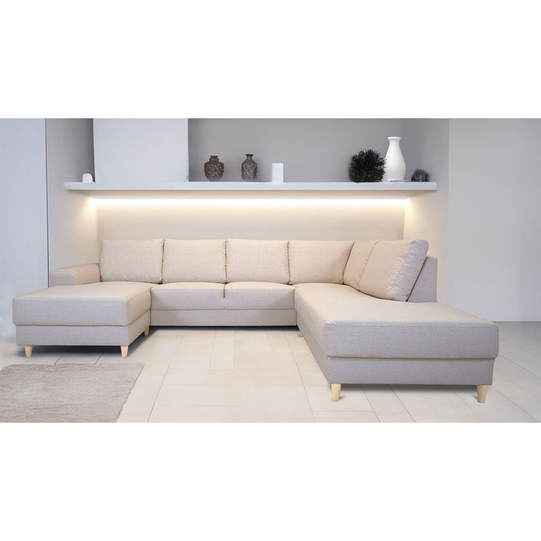 Nordic Ubank rechts gericht licht beige. Hoes Rating "colour fastness to light": 5. Hoes Rating "pilling": 4-5."Pilling", Opvulling van de stof, gaat van 0-5, waar 5 het beste is. "Colour fastness to light", Kleurechtheid, gaat van 1-8, waar 8 het beste is. Nordic U-bank rechts gericht Lichtbeige. Creëer een comfortabel en stijlvol ontmoetingspunt in uw huis met de Nordic U bank. Deze naar rechts gerichte versie in een elegante lichtbeige tint biedt zowel functionaliteit als esthetiek, perfect voor bijeenkomsten met familie en vrienden. De bank is ontworpen om optimaal comfort te bieden met het stevige PU-schuim in de zitting, wat zorgt voor een stabiele en comfortabele ondersteuning, terwijl de rugkussens, gevuld met korrels, zorgen voor een zachter en meer ontspannend comfort voor de rug.De Nordic U bank is ideaal voor grote gezinnen of voor mensen die graag gasten ontvangen. Het ruime formaat maakt het mogelijk om achterover te leunen, te ontspannen en alleen te genieten van rustige momenten, of samen te komen voor aangename momenten met vrienden. Het klassieke en strakke ontwerp van de bank past gemakkelijk in de meeste huizen en voegt een verfijnde toets toe die in het oog springt.De elegante poten contrasteren mooi met de rechte lijnen van de vorm van de bank en zorgen voor een opvallende totaalindruk. De Nordic U-sofa biedt de mogelijkheid om te kiezen tussen verschillende varianten, zodat u de uitstraling kunt creëren die het beste bij uw interieur past. Houd jij van een stoere en minimalistische look, of wil je juist een warmere, klassieke look?Welke stijl u ook kiest, de Nordic U bank zal een praktische en stijlvolle keuze zijn die zowel tijdloos als functioneel in uw huis zal verschijnen.