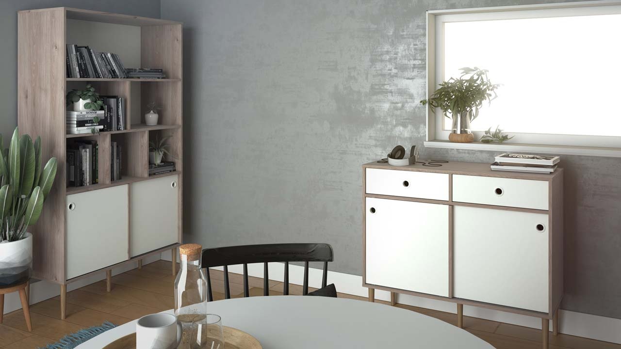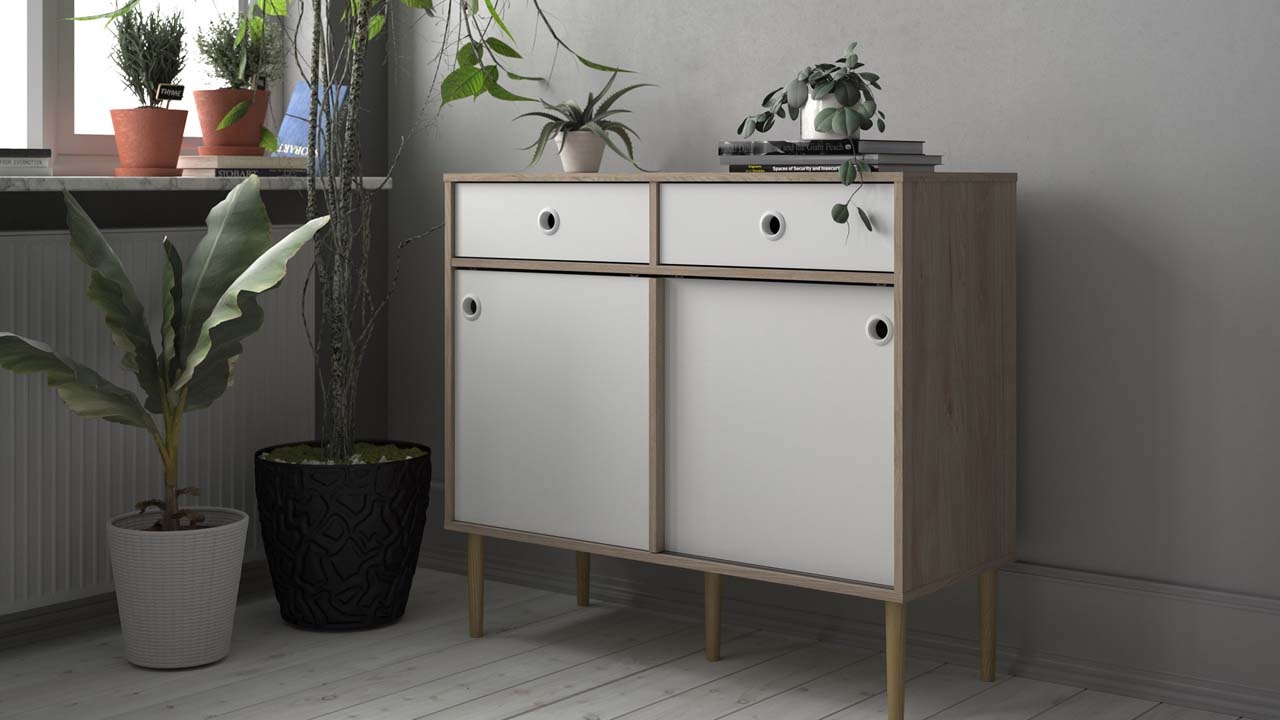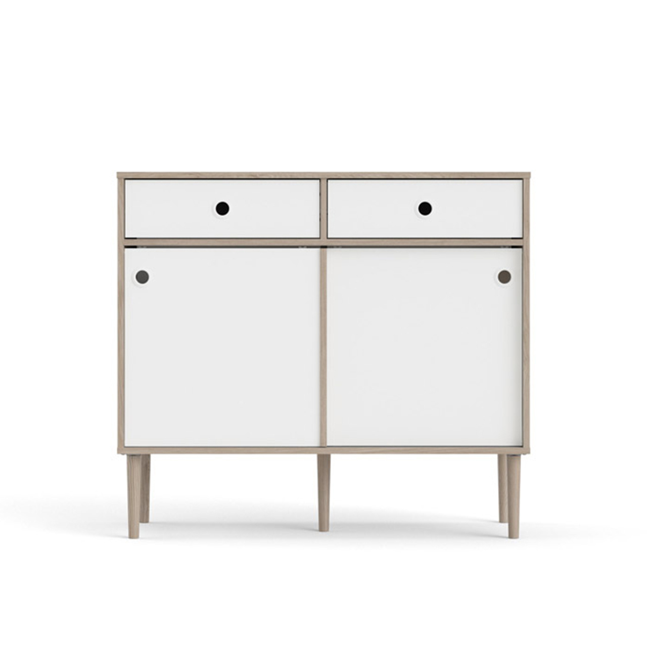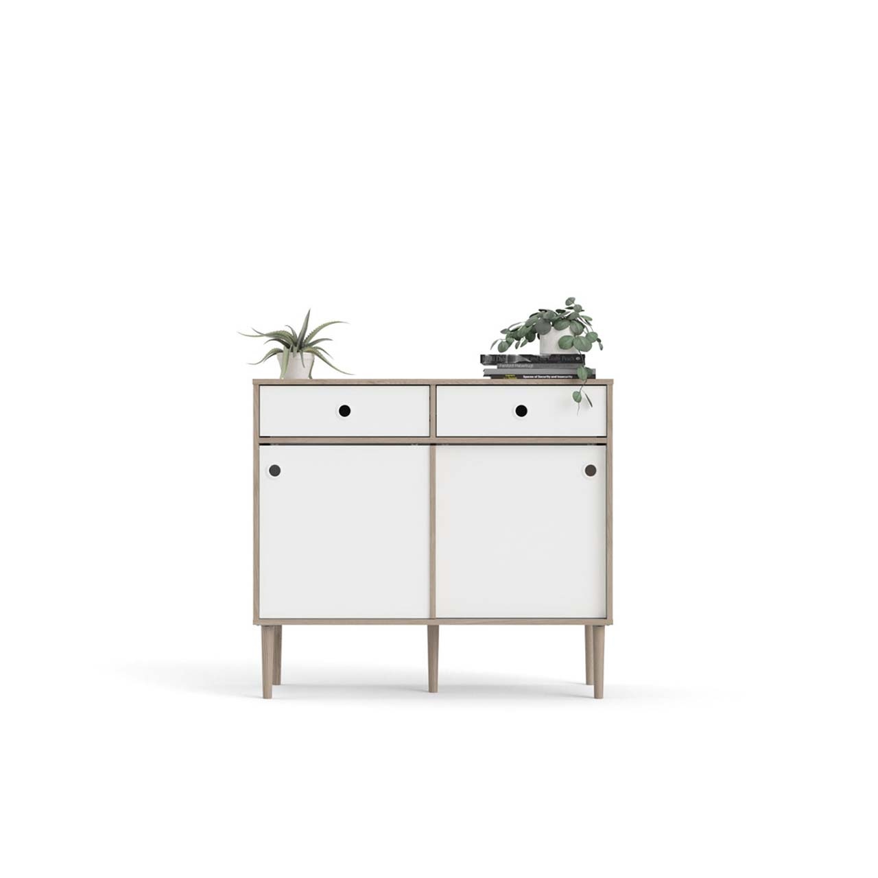 tom Penny dressoir 2 schuifdeuren en 2 laden Hickory decor en mat wit.