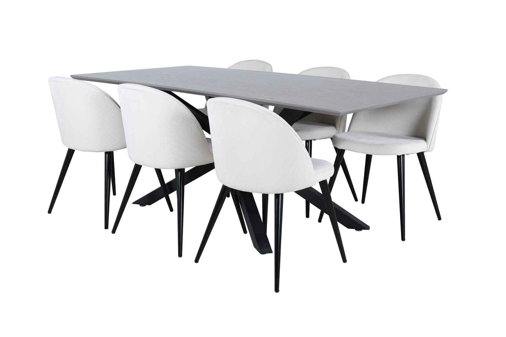 PiazzaGRBL eethoek eetkamertafel grijs en 6 Velvet eetkamerstoel fluweel beige, zwart. Piazza tafel 60-29892-858. Tafel cm: L180 x D90 x H76. Tafel: hout, ijzer, MDF, fineer . Velvet stoel 60-19960-890. Aantal 6 . Stoel cm: B50 x H76,5 x D57. Zithoogte cm: 46,5. Zitdiepte cm: 42,5. Zitbreedte cm: 41. Maximaal gewicht kg.: 110. Stof. Fluweel. Stoel: 100% polyester fluweel, hout, schuim, staal .