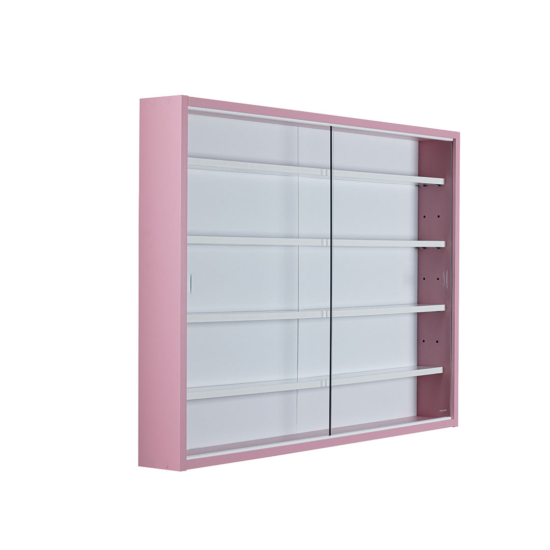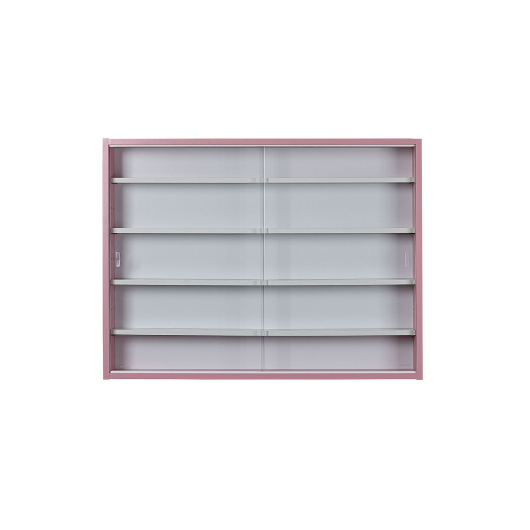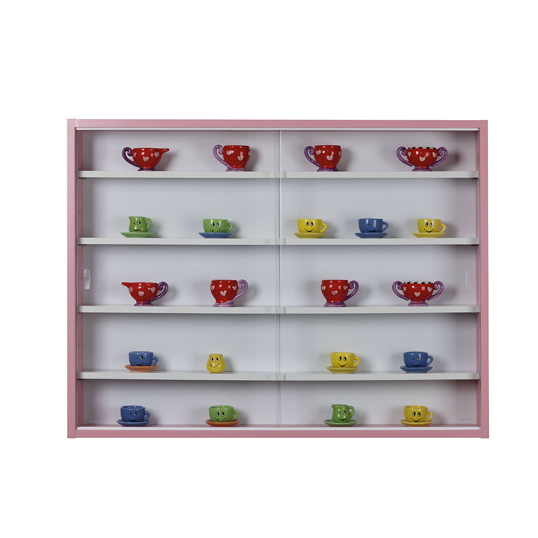 Pinkruby vitrinekast, 2 schuifdeuren roze, wit. De Pinkruby vitrinekast is een elegante en moderne opbergoplossing die functionaliteit combineert met een uniek en kleurrijk design. De kast heeft twee glazen schuifdeuren waarmee je gemakkelijk je favoriete spullen, zoals serviesgoed, boeken of decoratieve spullen, kunt tentoonstellen en tegelijkertijd beschermen tegen stof. De combinatie van het roze frame en de witte planken zorgt voor een frisse en stijlvolle uitstraling die perfect past in kinderkamers, kantoren of creatieve ruimtes. Met zijn ruimtebesparende ontwerp en veelzijdige gebruik is de Pinkruby vitrinekast de perfecte keuze voor wie opbergruimte en esthetiek wil combineren.