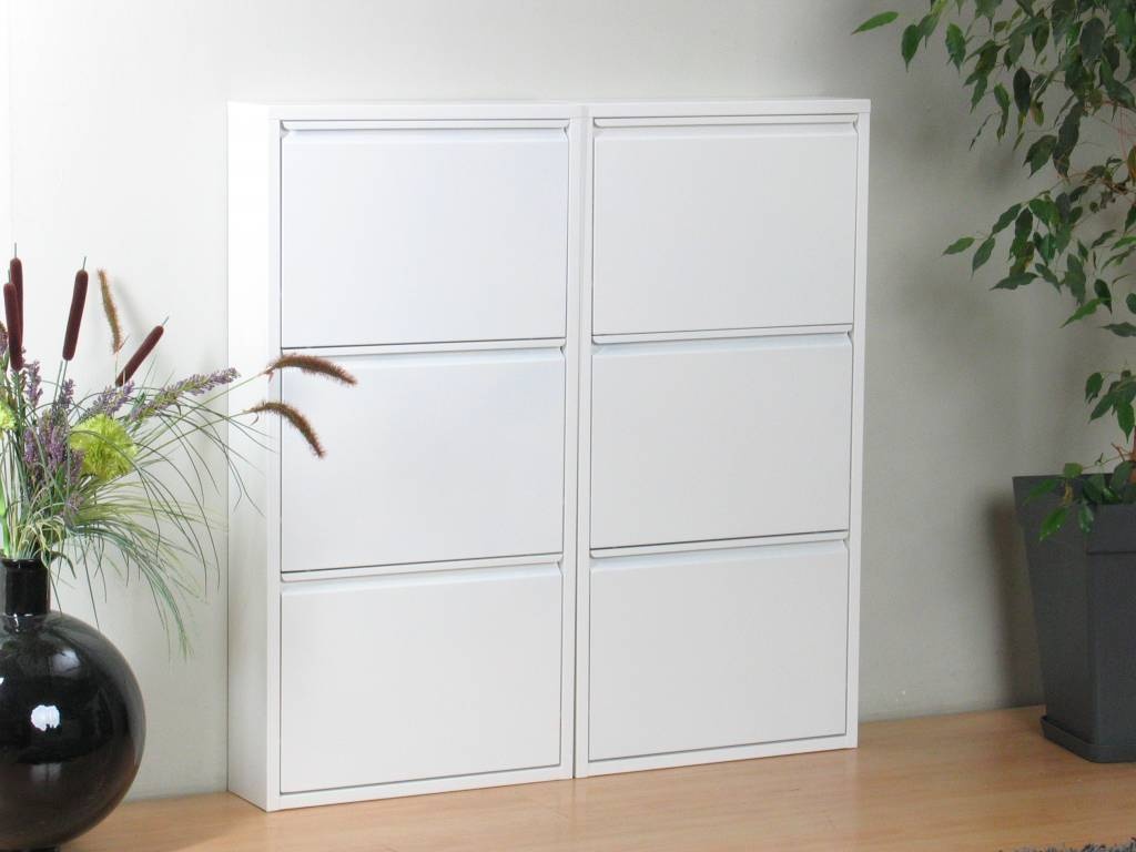 Een set van 2 schoenenkasten Pisa van wit metaal met elk 3 vakken. Alle schoenen van het hele gezin keurig opgeborgen achter één van de kleppen. Ook verkrijgbaar met 4 en met 5 vakken, voor nog meer opruimgemak, of in het zwart! ...Lees uitgebreide product informatie
