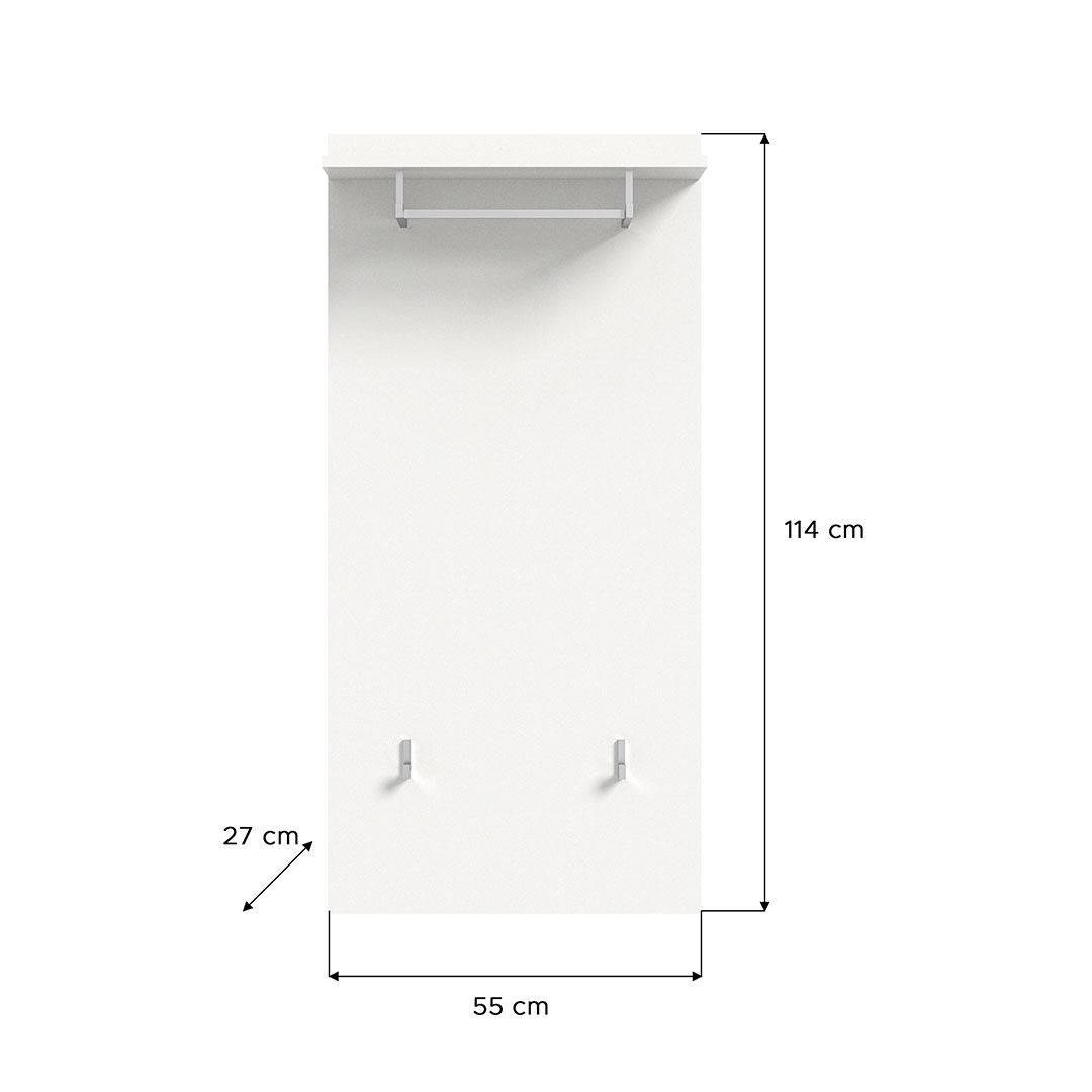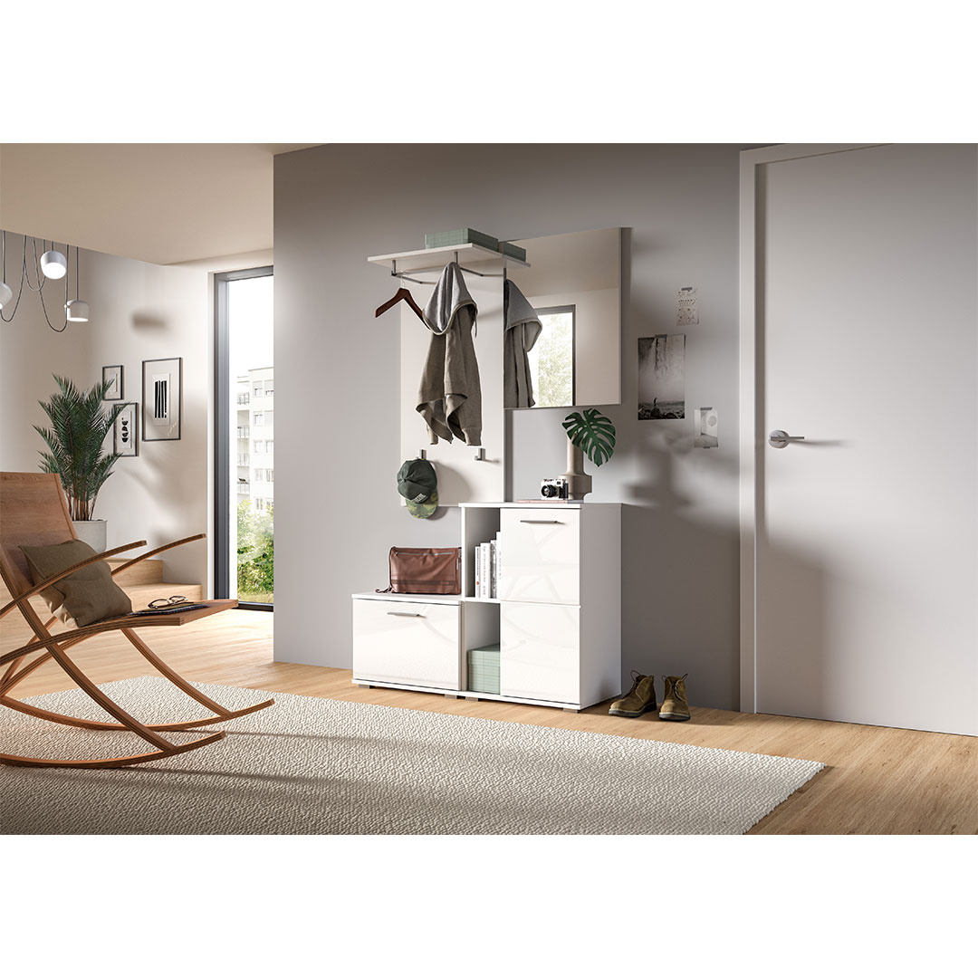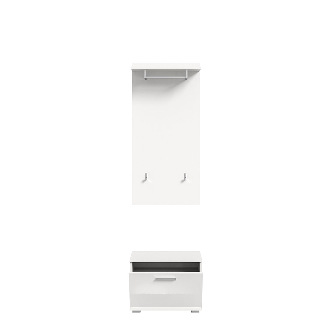 Prego halmeubelset wit hoogglans. Losse planken: 2. De Prego entreemeubelset in hoogglans wit biedt een stijlvolle en praktische oplossing voor uw entree. De set bevat zowel een opbergmeubel met lade als een aan de muur gemonteerd plankensysteem met haken, waaraan je gemakkelijk jassen, tassen of sleutels kunt ophangen. De moderne hoogglansafwerking maakt de set zowel functioneel als esthetisch aantrekkelijk, en de twee losse planken bieden flexibiliteit bij het opbergen. Deze set is ideaal voor het moderne huishouden dat een eenvoudige maar functionele opbergoplossing zoekt.