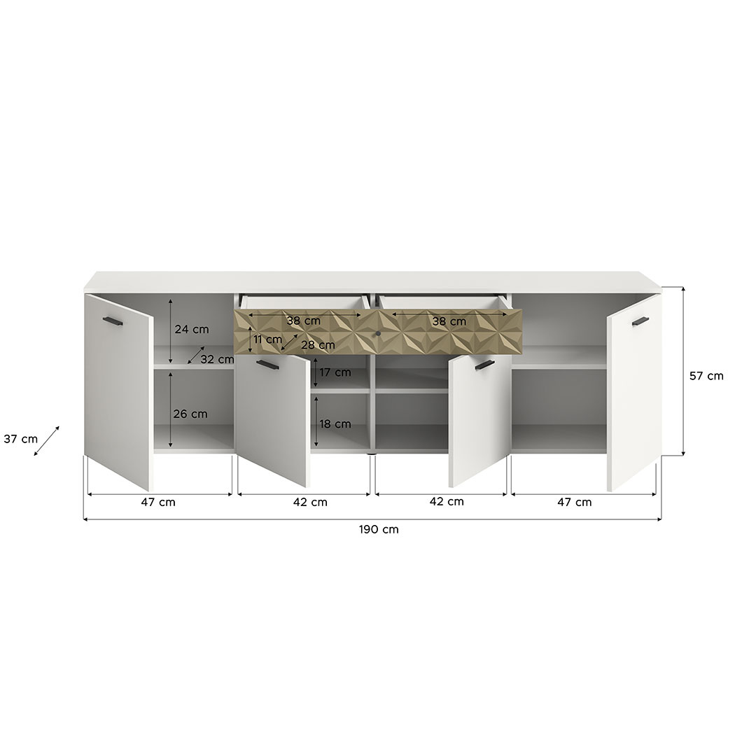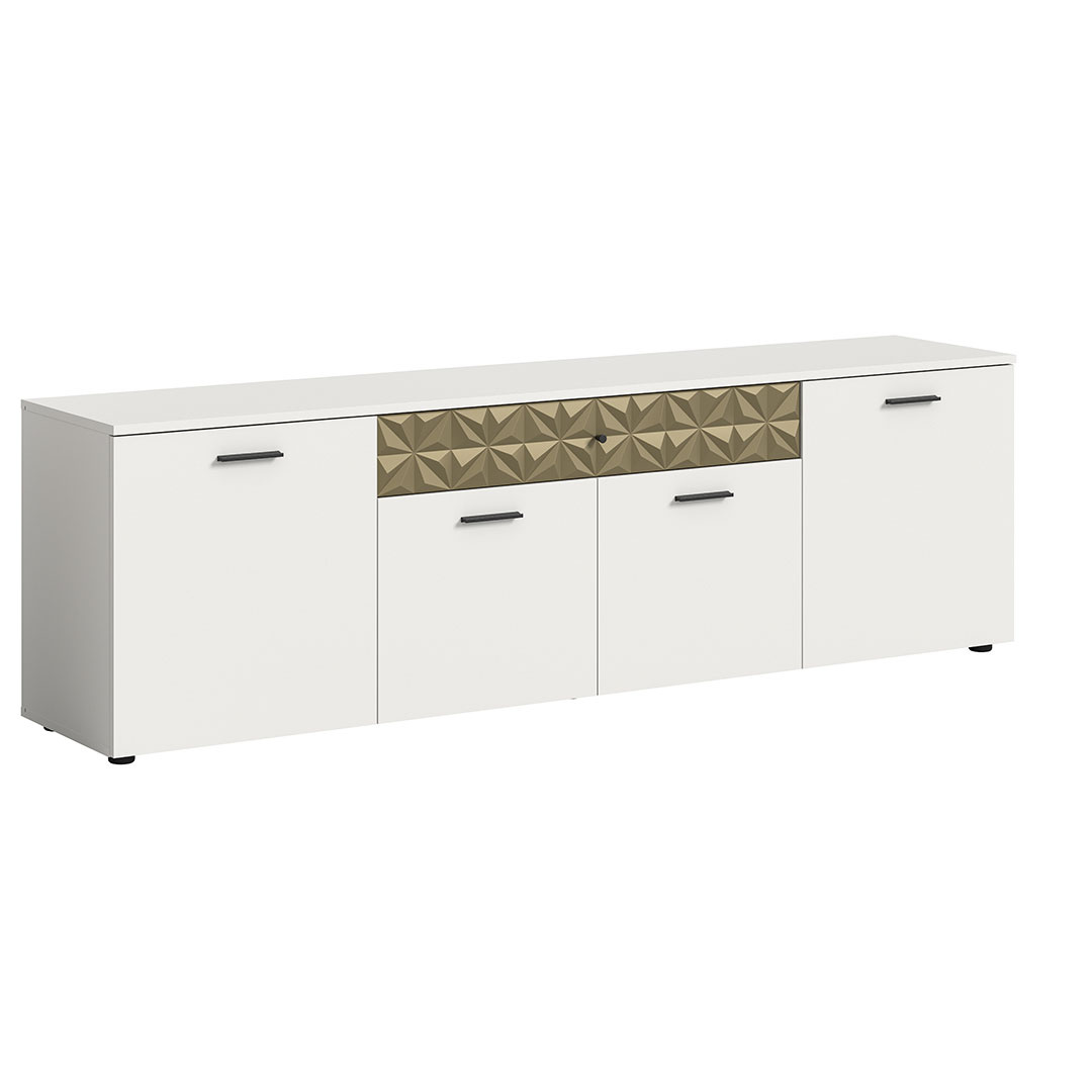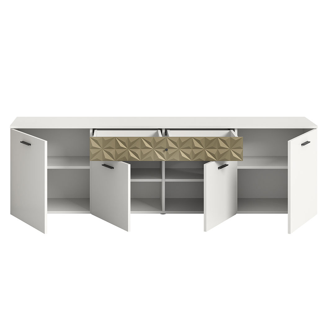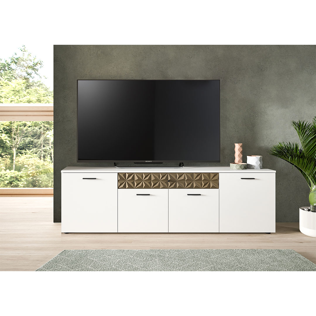 Prisma TV-meubel 1 lade 4 deuren wit. Losse planken: 4. Het Prisma tv-meubel in wit is een elegante en functionele opbergoplossing voor de woonkamer. Het meubel heeft één lade en vier deuren, waardoor er voldoende opbergruimte is voor televisieapparatuur, boeken, afstandsbedieningen en andere kleine spullen. Het decoratieve 3D-patroondetail aan de voorkant geeft een stijlvol en uniek tintje aan het meubel, terwijl de witte afwerking ervoor zorgt dat het perfect past in moderne woningen. Met vier verstelbare planken biedt het meubilair flexibiliteit om voorwerpen van verschillende afmetingen op te bergen.