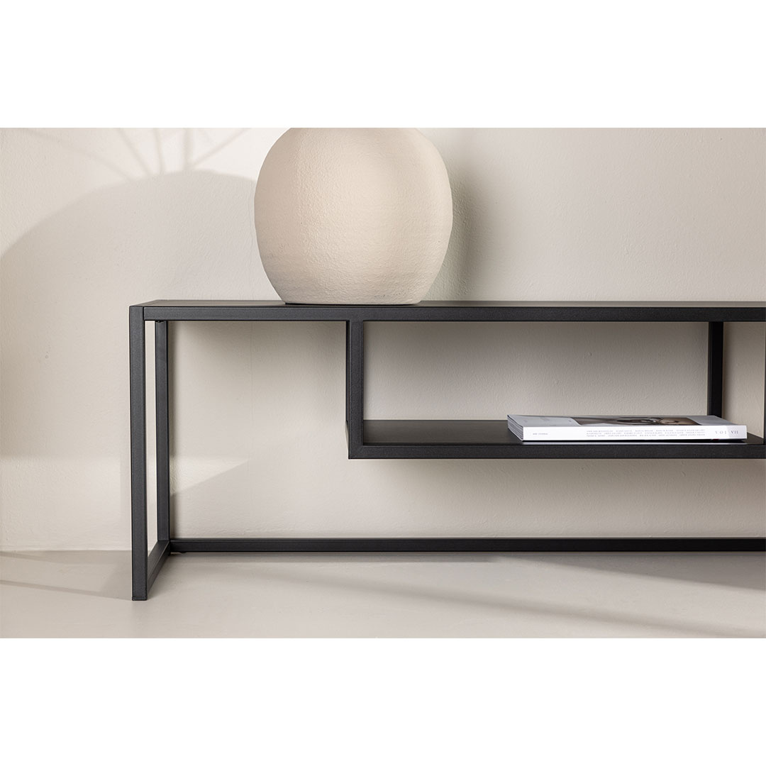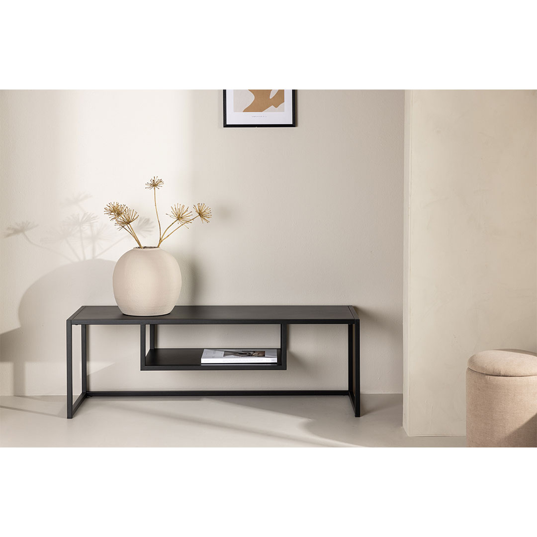 Riverside TV-meubel 1 plank zwart is een TV-meubel in de kleur Zwart, dat zowel stijl als functionaliteit in uw huis brengt. Riverside TV-meubel 1 plank zwart. Riverside is een elegant zwart stalen tv-meubel dat niet alleen je televisie kan dragen, maar ook een stijlvol decor aan je huis zal toevoegen! Dit tv-meubel is gemaakt van duurzaam zwart staal en combineert een minimalistische stijl met functionaliteit om je de ultieme woonkamer- en tv-ervaring te bieden. Het rechthoekige tafelblad en het smalle onderstel in zwart staal zorgen voor een luchtige sfeer in de kamer. Het voelt alsof je televisie in de lucht zweeft, waardoor je een gevoel van ruimte en openheid krijgt. Bovendien beschikt hij over slimme opbergmogelijkheden. Onder het tafelblad zit een slimme en discrete opbergplank verborgen. Hier kun je al je tv-accessoires - van afstandsbedieningen tot gameconsoles - gemakkelijk netjes en geordend opbergen. Maar misschien is het Riverside tv-meubel niet alleen een opbergoplossing, het is ook een leuk interieurdetail. De zwarte stalen constructie geeft een moderne en verfijnde uitstraling aan uw ruimte. Het is niet zomaar een tv-meubel, het is een kunstwerk dat je hele interieur naar een hoger niveau zal tillen. Koop dus vandaag nog de jouwe en kijk hoe hij naadloos in het moderne huis past!