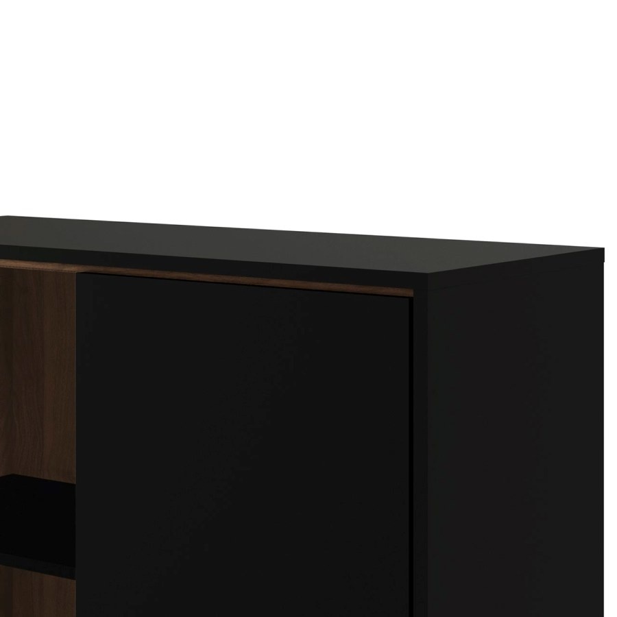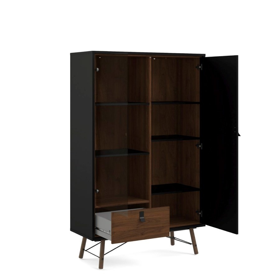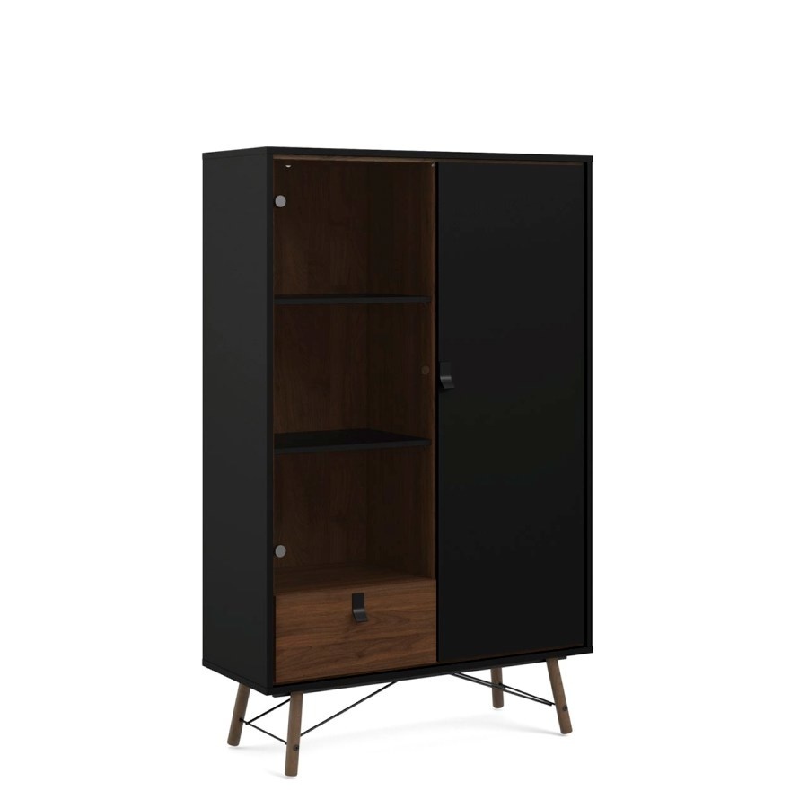 Rye vitrinekast 1 glazen deur, 1 deur, 1 lade mat zwart, walnoot decor.