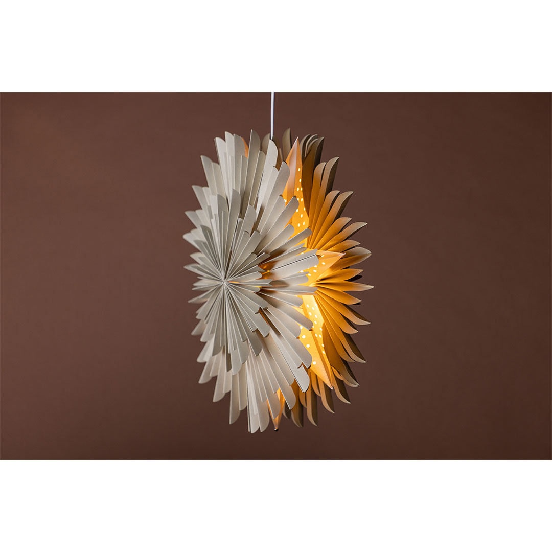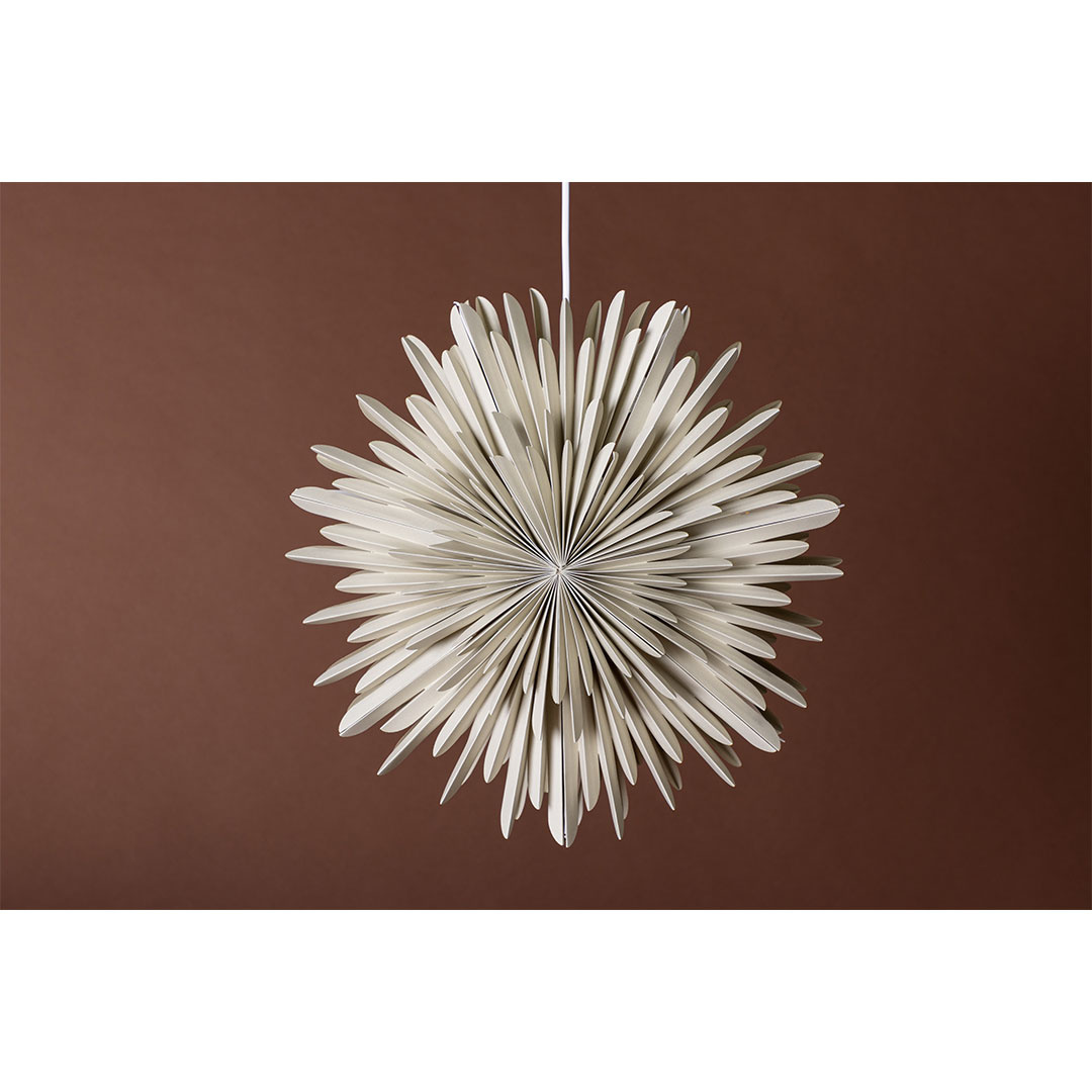 Sälen Kerstster met lichtpapier Ø46cm hanger beige is een kerstlamp in beige kleur die zowel stijl als functionaliteit in uw huis brengt. Sälen Kerstster met licht papier Ø46cm hanglamp beige. Lichtbron: E14. Watt (W): 15. Excl. Gloeilamp. Incl. draad. Verspreid een gezellige gloed in huis en creëer een sfeervol gevoel met behulp van deze beige papieren ster uit de serie Sälen! Deze prachtige plafondlamp in de vorm van een bloeiende ster voorziet je huis van warme verlichting die bijdraagt aan een rustige huiselijke sfeer. Met meerdere lagen gevouwen papier zorgt Sälen voor een aangename hoeveelheid licht die je kamer vult met een subtiele gloed. In de donkere herfst- en winterdagen of tijdens de feestelijke kerstviering wordt Sälen een perfect interieurdetail. Het creëert een warme en gastvrije sfeer die uw huis onmiddellijk verandert in een gezellige plek om uw vrije tijd door te brengen. De lamp hangt aan het witte snoer, dat zich discreet verbergt tegen de lichte muur of raam. Onze Sälen-lampen zijn verkrijgbaar in verschillende kleuren en maten, zodat u degene kunt kiezen die het beste bij uw eigen unieke stijl en inrichting past. Of je nu een subtiele lamp of een vleugje kleur als decoratie wilt, Sälen creëert overal een gezellige sfeer! Afmetingen: 46 cm.