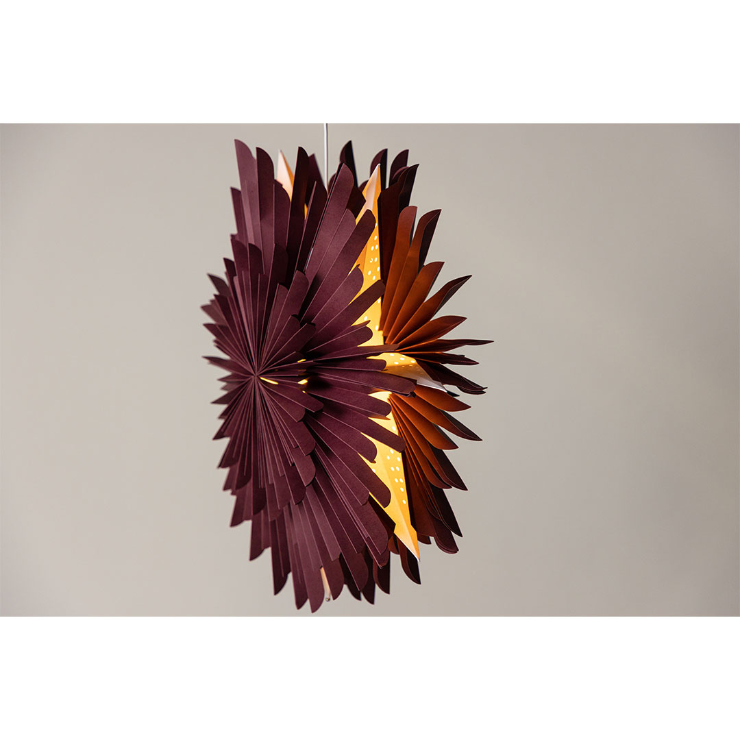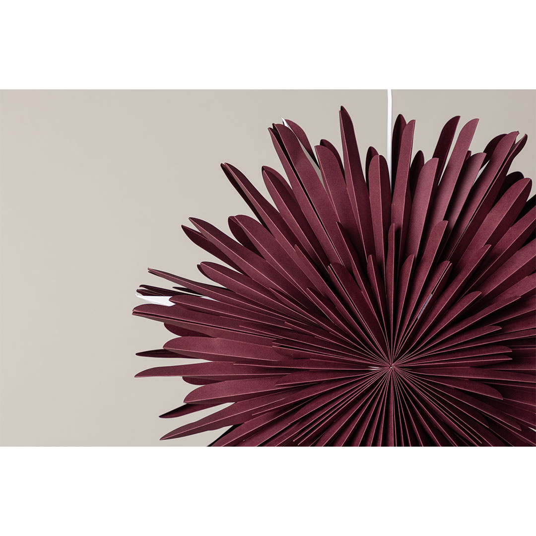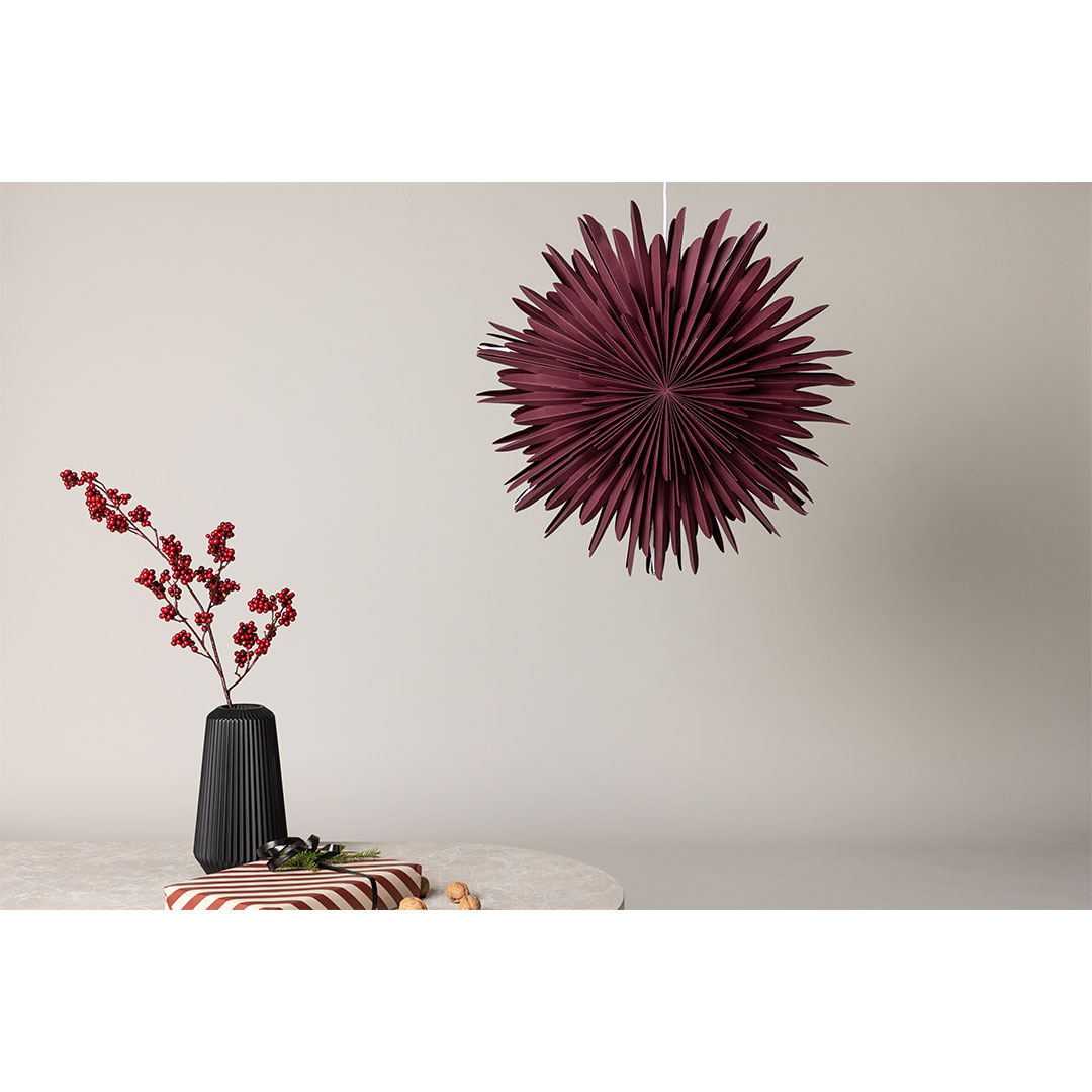 Sälen Kerstster met lichtpapier Ø60cm hanger donkerrood is een kerstlamp in donkerrode kleur die zowel stijl als functionaliteit in uw huis brengt. Sälen Kerstster met licht papier Ø60cm hanger donkerrood. Lichtbron: E14. Watt (W): 15. Excl. Gloeilamp. Incl. draad. Creëer een gezellige en huiselijke sfeer met de plafondlamp Sälen - Perfect voor de herfst en Kerstmis! Deze prachtige, donkerrode papieren ster verspreidt een warm en gezellig licht in je kamer, waardoor hij perfect is voor zowel de prachtige kleurveranderingen in de herfst als de feestelijke kerstvieringen. Maak uw interieur op een fantastische en charmante manier compleet! De Sälen plafondlamp is verkrijgbaar in verschillende maten, afhankelijk van uw behoeften en de afmetingen van de kamer. Met zijn discrete witte snoer past de lamp elegant in uw interieur en wordt hij een stijlvol element. Het is eenvoudig te installeren en zorgt al snel voor een sfeervol gevoel in huis. De warme donkerrode kleur draagt bovendien bij aan een zachte en aangename verlichting waardoor je je ontspannen en blij voelt. Afmetingen: 60 cm. Dit product is gemaakt met oog voor detail, wat zowel esthetische aantrekkingskracht als hoge duurzaamheid garandeert. Het is ontworpen met zowel functionaliteit als stijl in gedachten, waardoor het de perfecte keuze is voor elke kamer in uw huis. De gebruikte materialen zijn van hoge kwaliteit, waardoor het product een lange levensduur heeft en bestand is tegen dagelijks gebruik. Of het nu voor opslag is of als decoratieve toevoeging, dit product zal uw interieur naar een hoger niveau tillen en extra comfort en elegantie in uw huis brengen.
