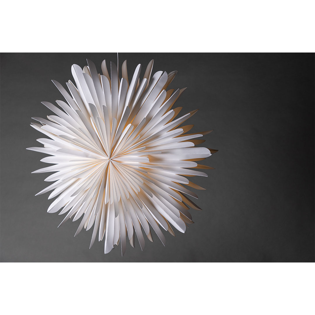 Sälen Kerstster met lichtpapier Ø80cm hanglamp wit is een kerstlamp in witte kleur die zowel stijl als functionaliteit in uw huis brengt. Sälen Kerstster met licht papier Ø80cm hanger wit. Lichtbron: E14. Watt (W): 15. Excl. Gloeilamp. Incl. draad. Deze prachtige witte papieren ster is de perfecte verlichting om een persoonlijke en gezellige sfeer in huis te creëren! Of het nu tijdens de mysterieuze herfstavonden is of tijdens de kerstfestiviteiten, de plafondlamp uit de serie Sälen verspreidt een warm en uitnodigend licht dat uw kamer in één klap in een oase van rust verandert. Deze witte plafondlamp is verkrijgbaar in verschillende maten, zodat u degene kunt kiezen die perfect bij uw kamer past. Hang hem in het keukenraam, de slaapkamer of bij de bank om het charmante licht te verspreiden waar je op donkere dagen naar verlangt. Het stervormige ontwerp van de lamp biedt ook verschillende praktische voordelen. Hierdoor kan de lamp het licht gelijkmatig in alle richtingen verspreiden en een aangename en zachte verlichting creëren. Plaats hem waar hij de meeste liefde en waardering krijgt en geniet van je favoriete activiteiten zoals lezen, handwerken of gewoon ontspannen in een sfeer vol vrede en harmonie! Afmetingen: 80 cm. Dit product is gemaakt met oog voor detail, wat zowel esthetische aantrekkingskracht als hoge duurzaamheid garandeert. Het is ontworpen met zowel functionaliteit als stijl in gedachten, waardoor het de perfecte keuze is voor elke kamer in uw huis. De gebruikte materialen zijn van hoge kwaliteit, waardoor het product een lange levensduur heeft en bestand is tegen dagelijks gebruik. Of het nu voor opslag is of als decoratieve toevoeging, dit product zal uw interieur naar een hoger niveau tillen en extra comfort en elegantie in uw huis brengen.