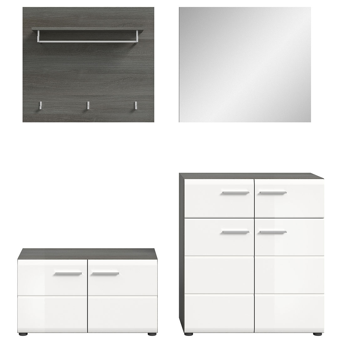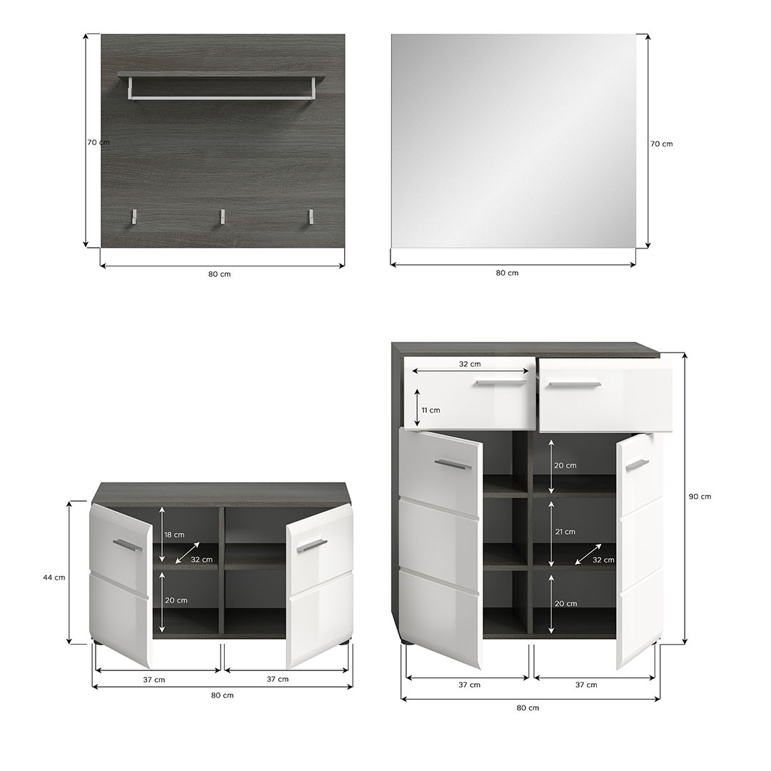 Salsa halmeubelset wit hoogglans. Losse planken: 6. Halmeubelset Salsa in hoogglans wit is de perfecte oplossing voor moderne opbergruimte en een georganiseerde inkomhal. De set bestaat uit een kapstok met drie haken, een spiegel, een lade en kastmodules met meerdere planken. Met de zes uitneembare planken krijg je de flexibiliteit om de opbergruimte naar behoefte aan te passen. Het gecombineerde gebruik van hoogglans en donkere houtafwerking zorgt voor een stijlvol, maar functioneel ontwerp. De entreemeubelset is ideaal om uw spullen georganiseerd te houden en geeft uw entree een strakke en moderne uitstraling.