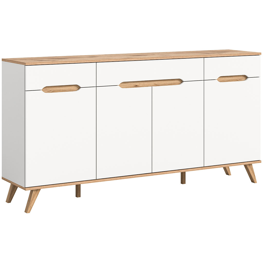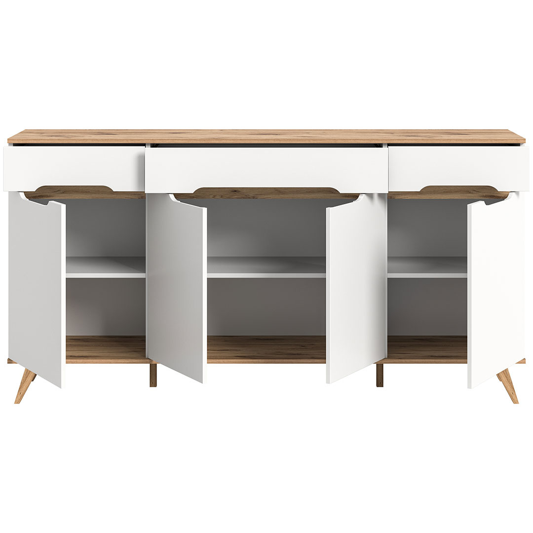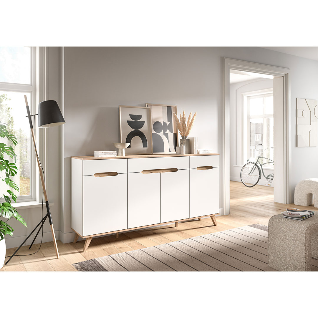 Scandi dressoir 3 lades 4 deuren wit. Deur Softclose. Losse planken: 3. Scandinavisch dressoir met witte afwerking geeft je huis een stijlvol Scandinavisch tintje. Met drie laden en vier deuren, waarvan de deuren zijn uitgerust met Softclose-technologie voor een zachte en stille sluiting, biedt dit dressoir zowel functionaliteit als elegantie. De uitneembare planken maken het mogelijk om de opbergruimte naar behoefte aan te passen, terwijl de klassieke houten handgrepen en de elegante houten poten een harmonieuze uitstraling creëren. De perfecte oplossing voor moderne opbergers met een vleugje natuurlijke warmte.