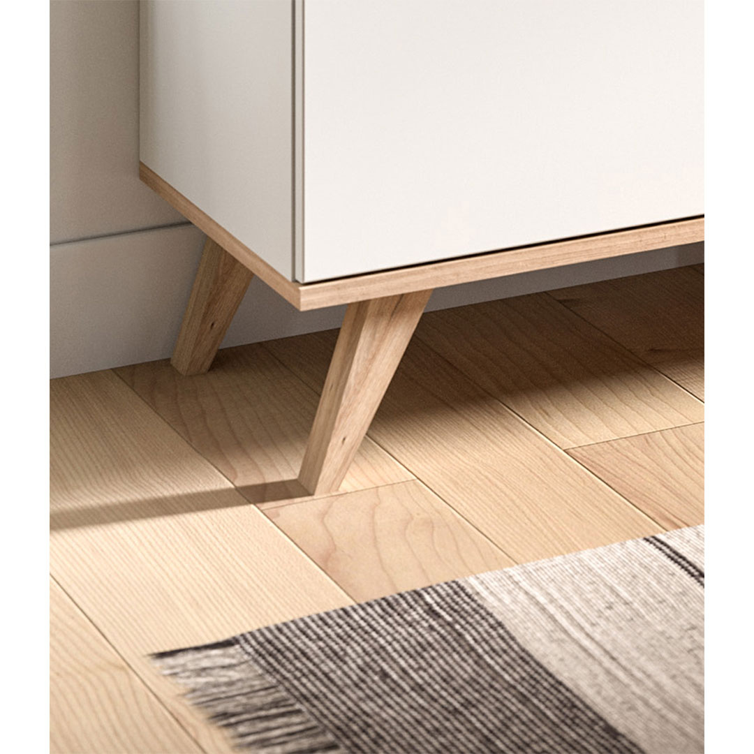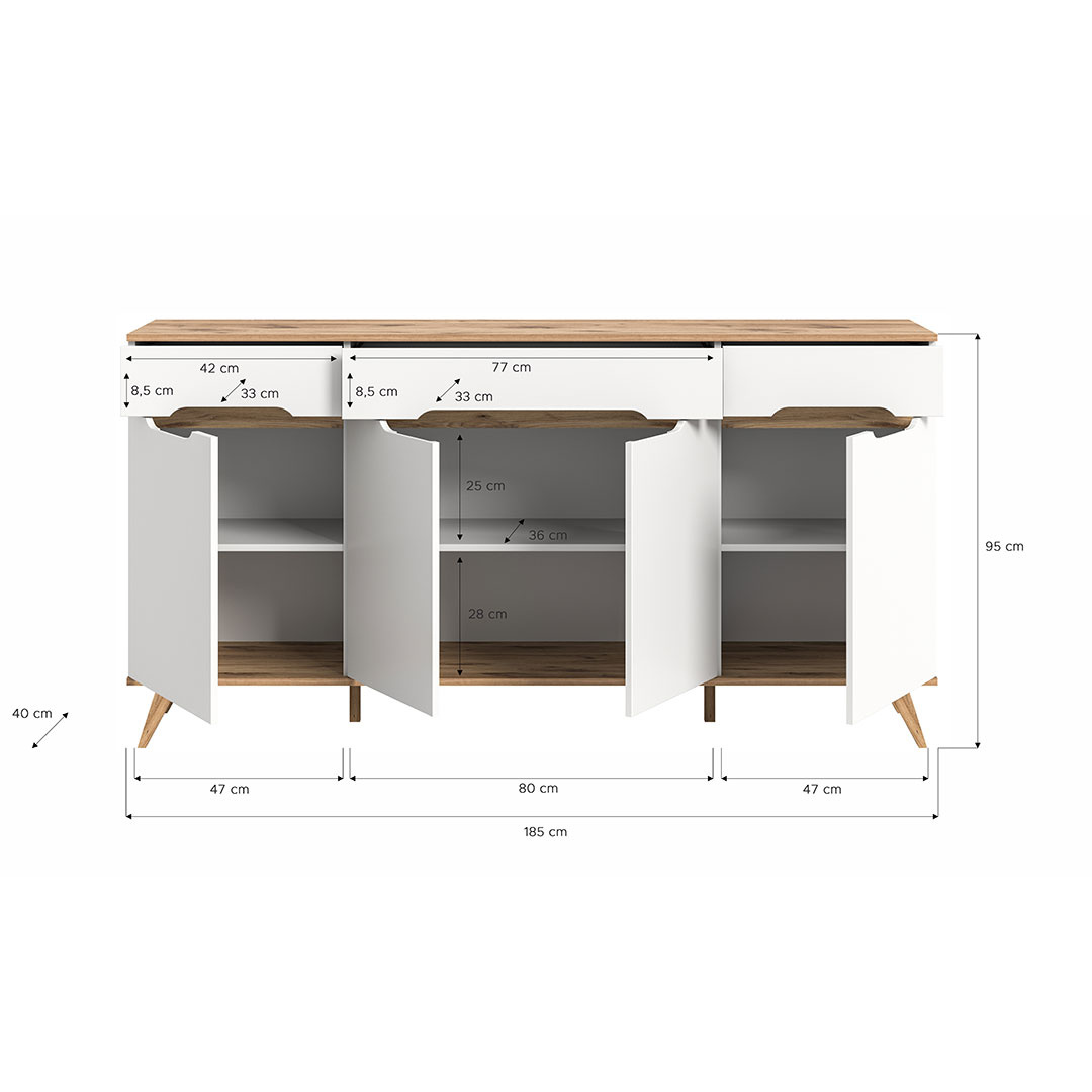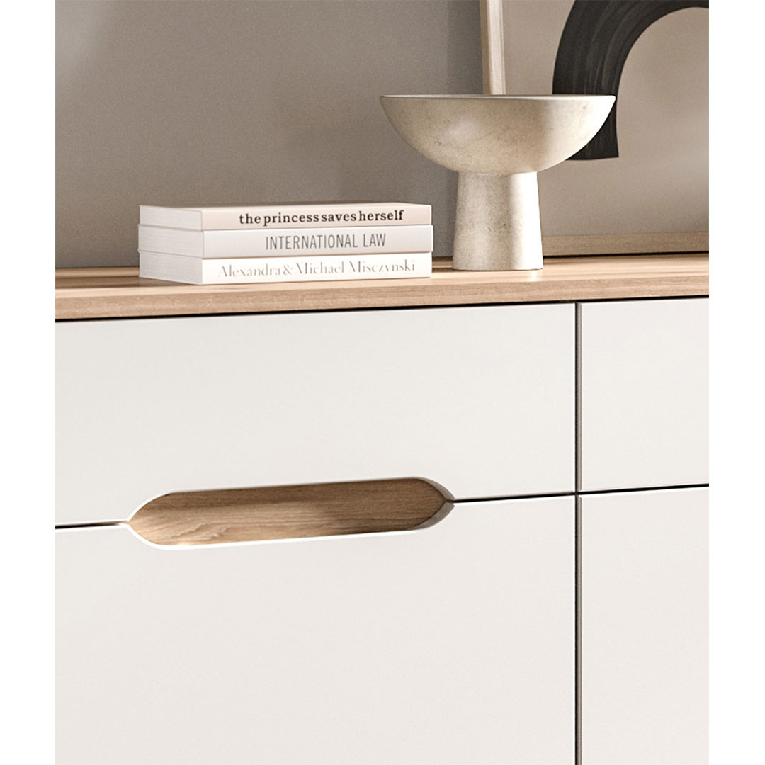Scandi dressoir 3 lades 4 deuren wit. Deur Softclose. Losse planken: 3. Scandinavisch dressoir met witte afwerking geeft je huis een stijlvol Scandinavisch tintje. Met drie laden en vier deuren, waarvan de deuren zijn uitgerust met Softclose-technologie voor een zachte en stille sluiting, biedt dit dressoir zowel functionaliteit als elegantie. De uitneembare planken maken het mogelijk om de opbergruimte naar behoefte aan te passen, terwijl de klassieke houten handgrepen en de elegante houten poten een harmonieuze uitstraling creëren. De perfecte oplossing voor moderne opbergers met een vleugje natuurlijke warmte.
