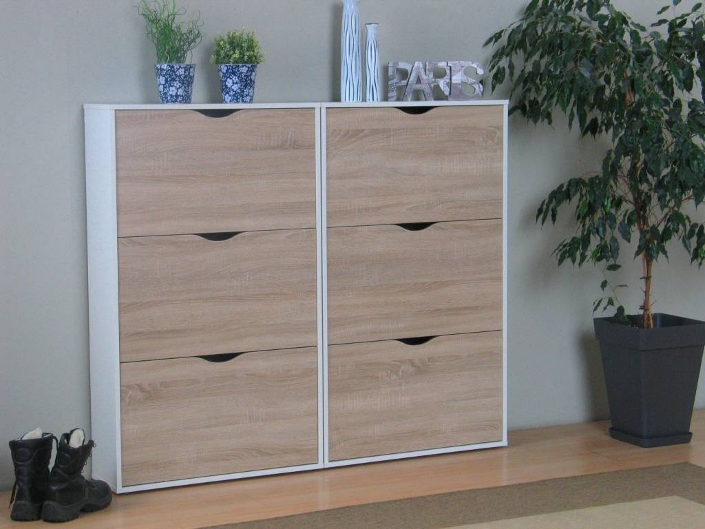- Witte schoenenkasten (set van 2 stuks) met elk 3 kleppen/vakken in eiken structuur