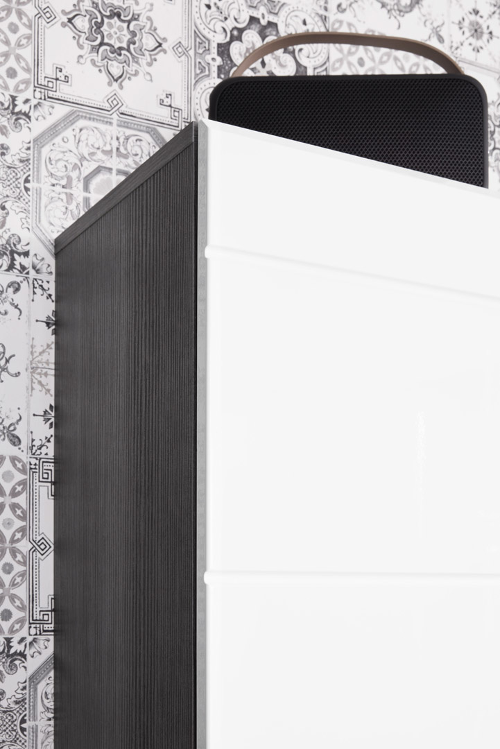 Materiaal: Houtmaterialen: FPY, MDF, HDF. Oppervlak: decor, melamine, glanseffecten, diepgetrokken. Rookzilver, wit hoogglans.